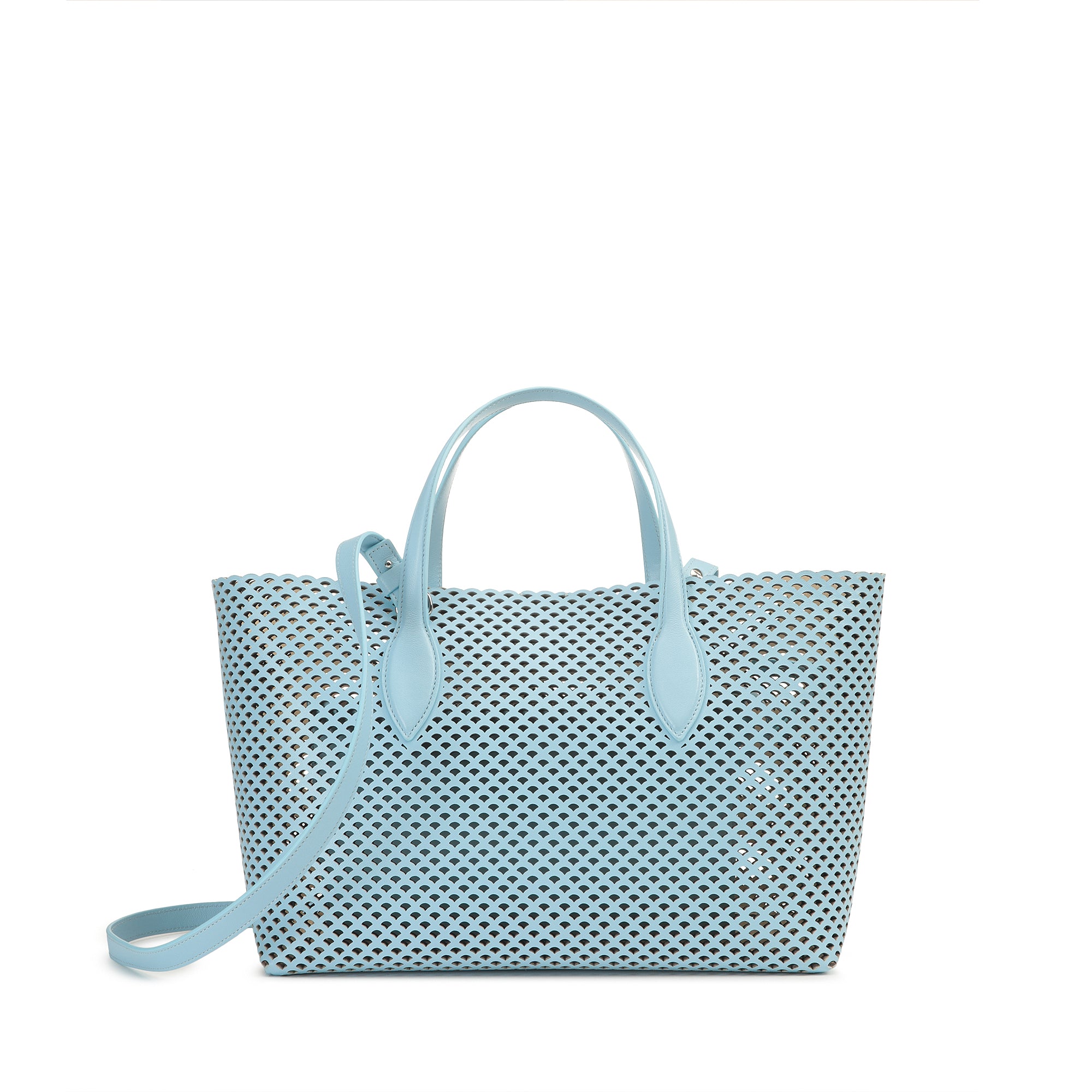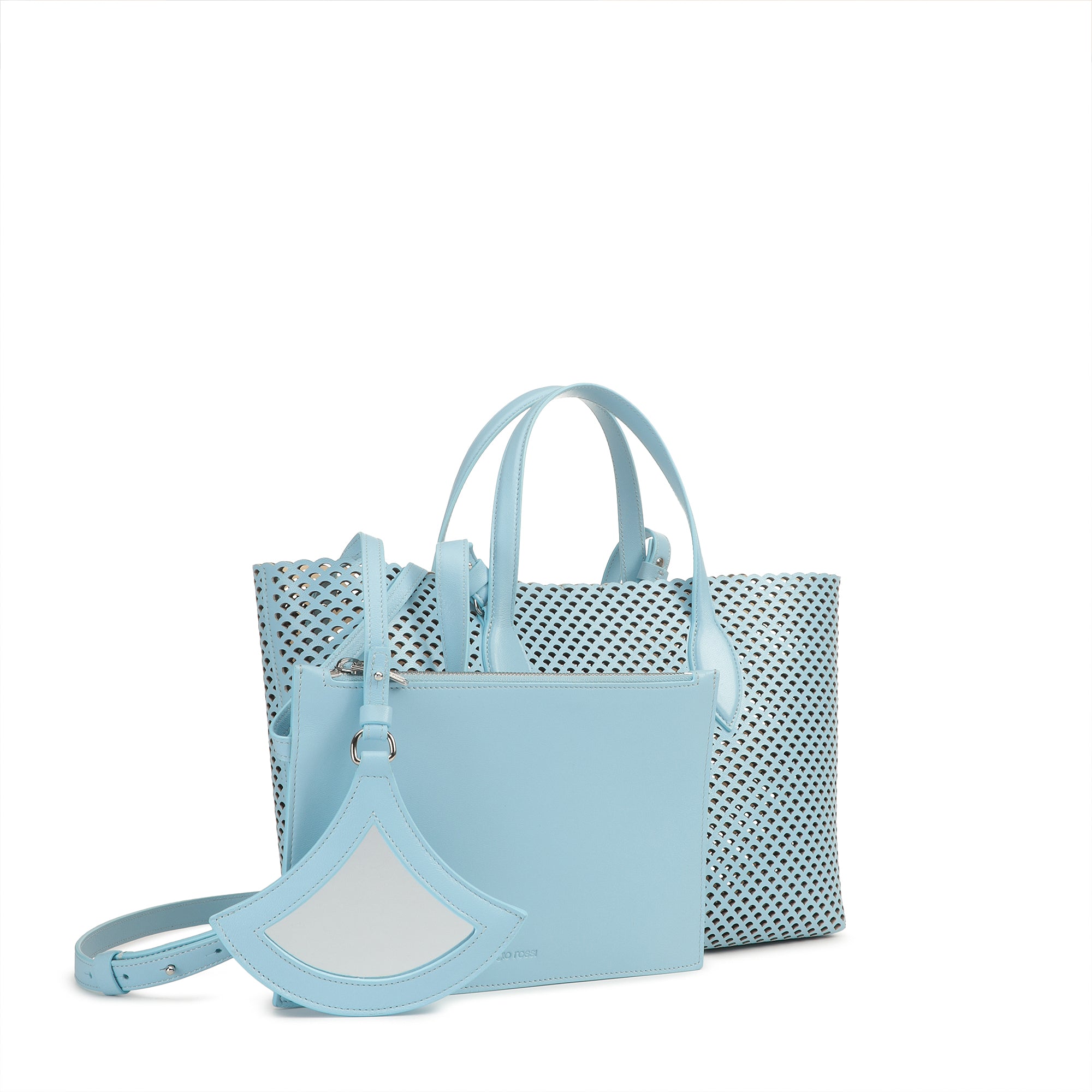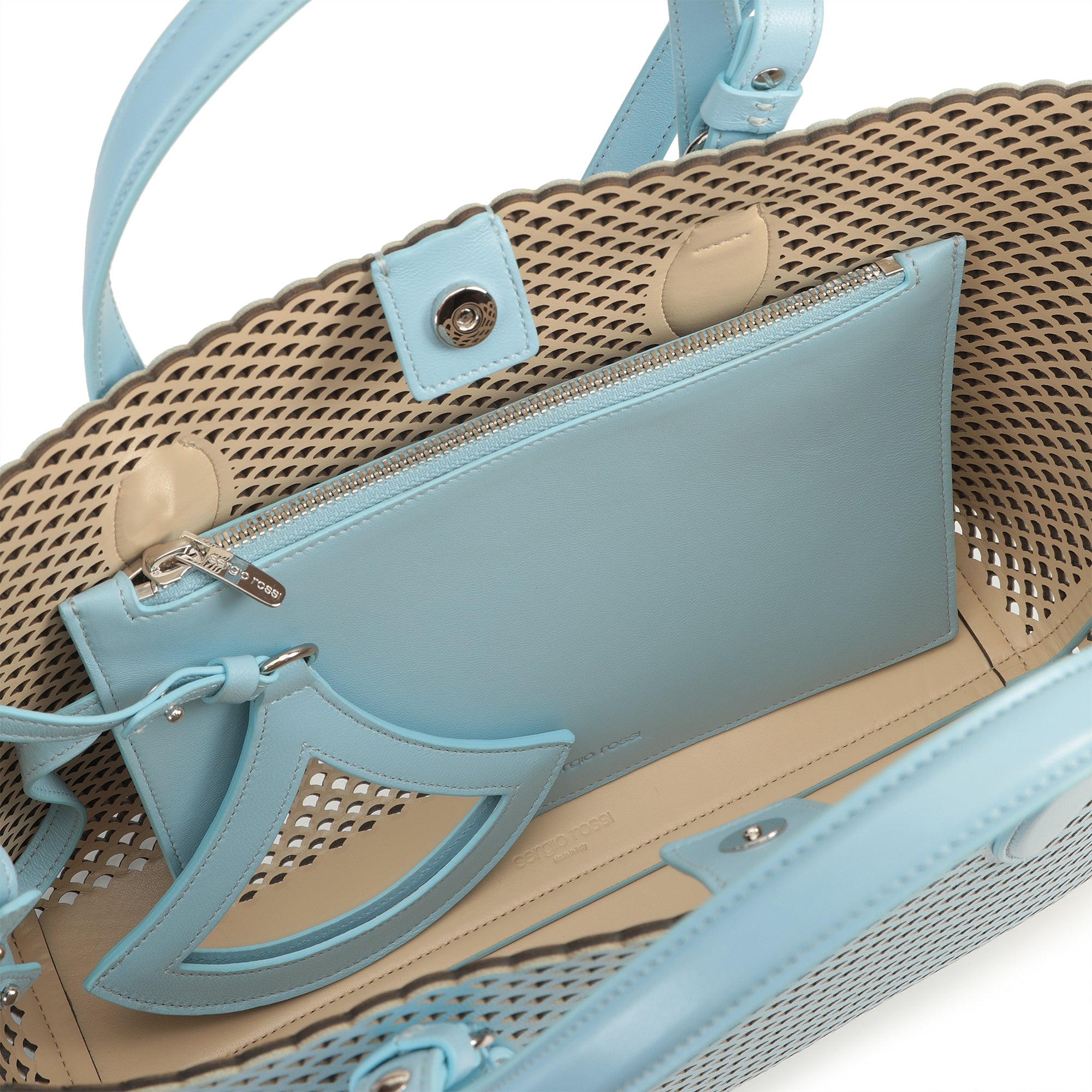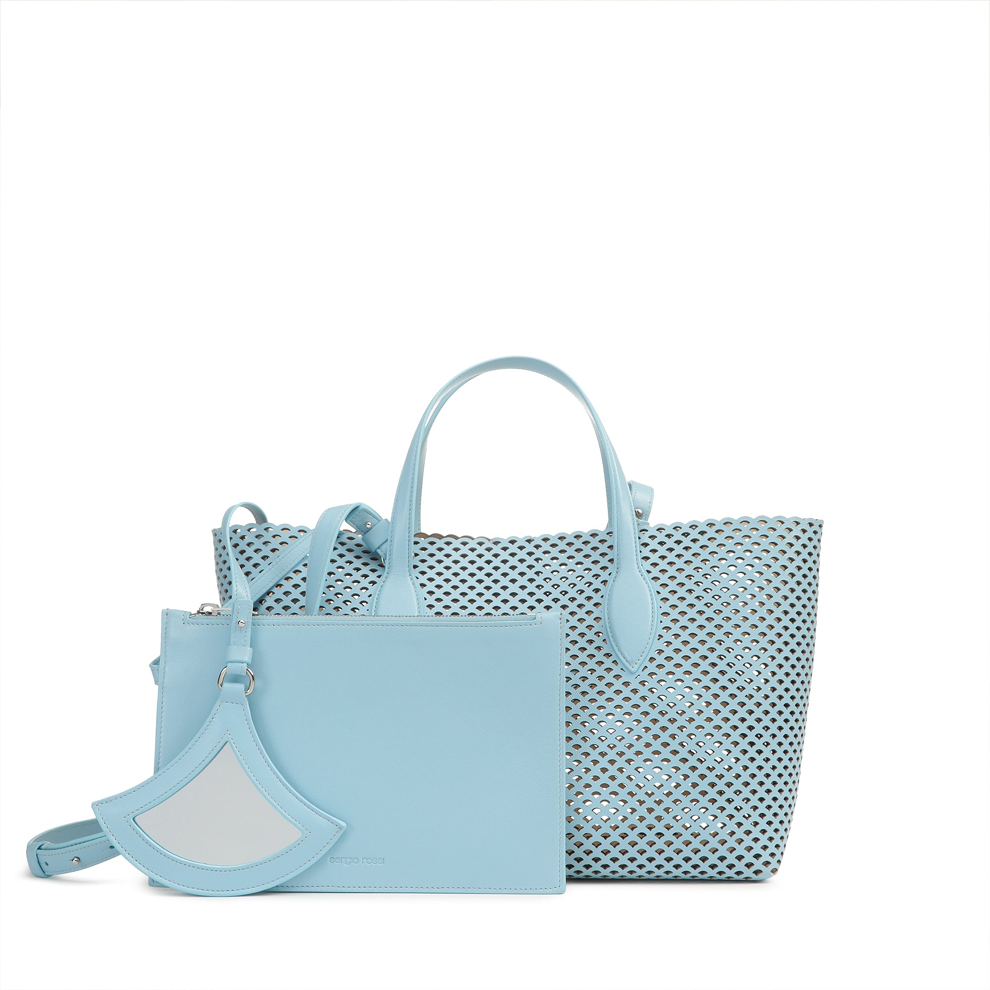 Made of soft light blue leather, this sr Micro Mermaid tote bag revisits an iconic motif from the archives. Featuring a practical inner pouch and mirror, also inspired by the brand’s signature openwork, it was designed for the woman who loves to accessorize with distinctive style.
