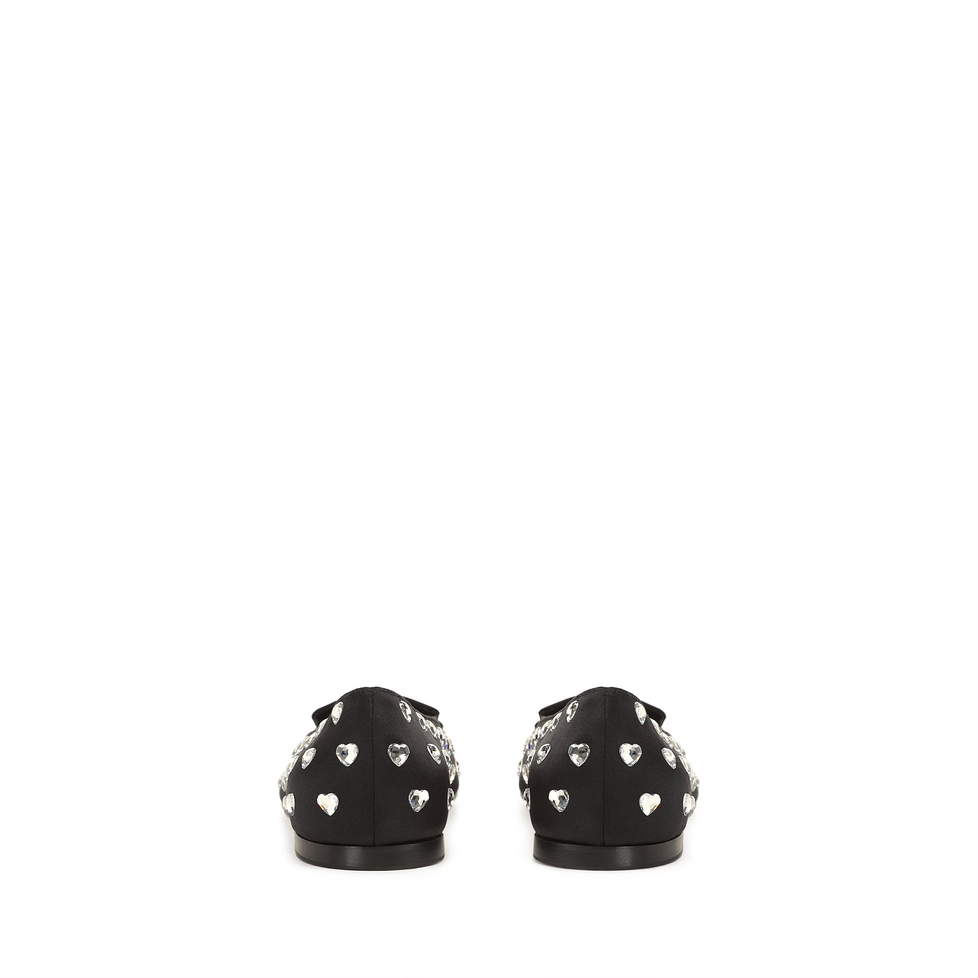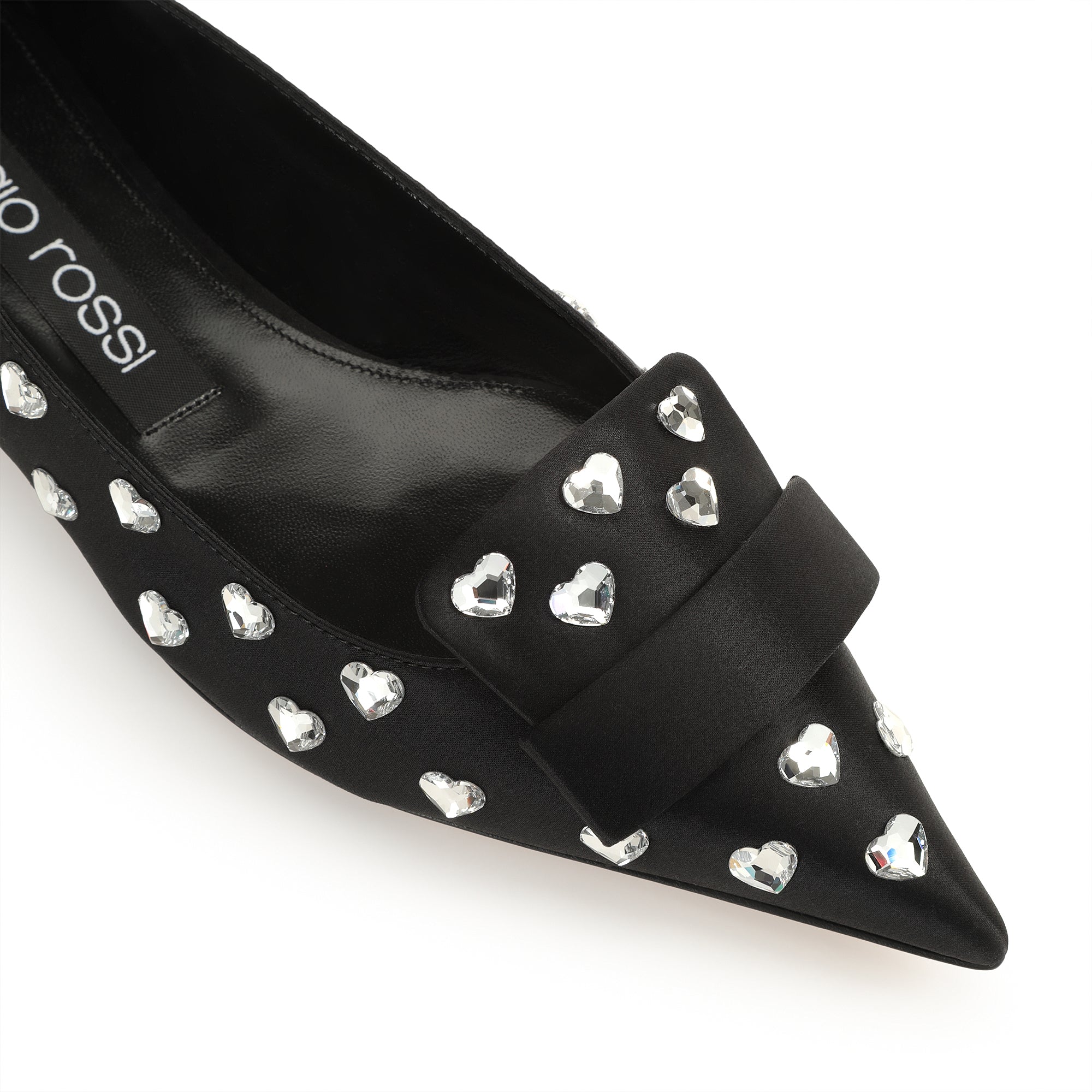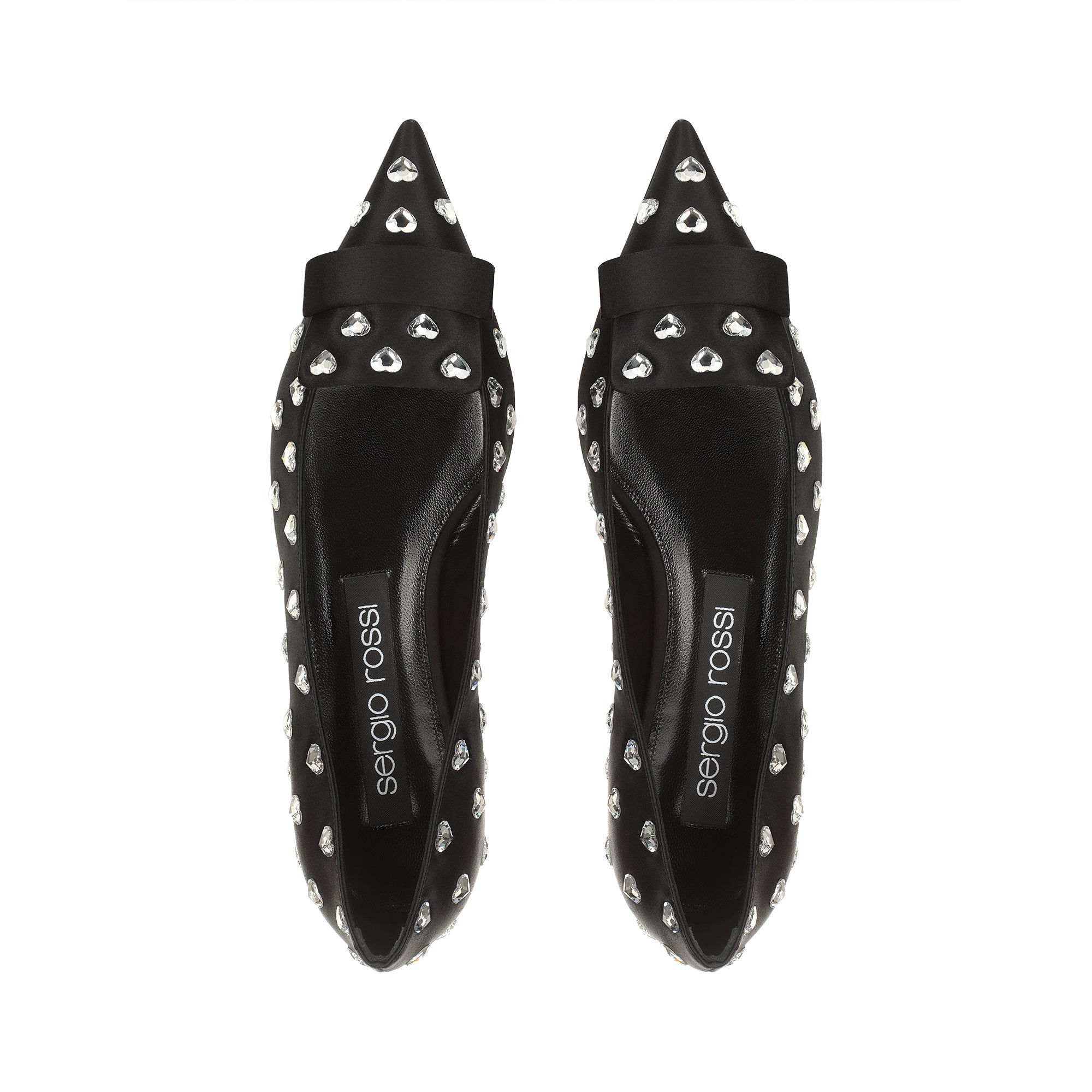 With exquisite allure, the elegant black-satin silhouette of these sr1 ballet flats features an unexpected interplay of reflections, created by matching crystals in a micro-pavé setting. Complete with a metallic plaque, they are tailor-made for women who like every feature of their look to reflect their femininity.
