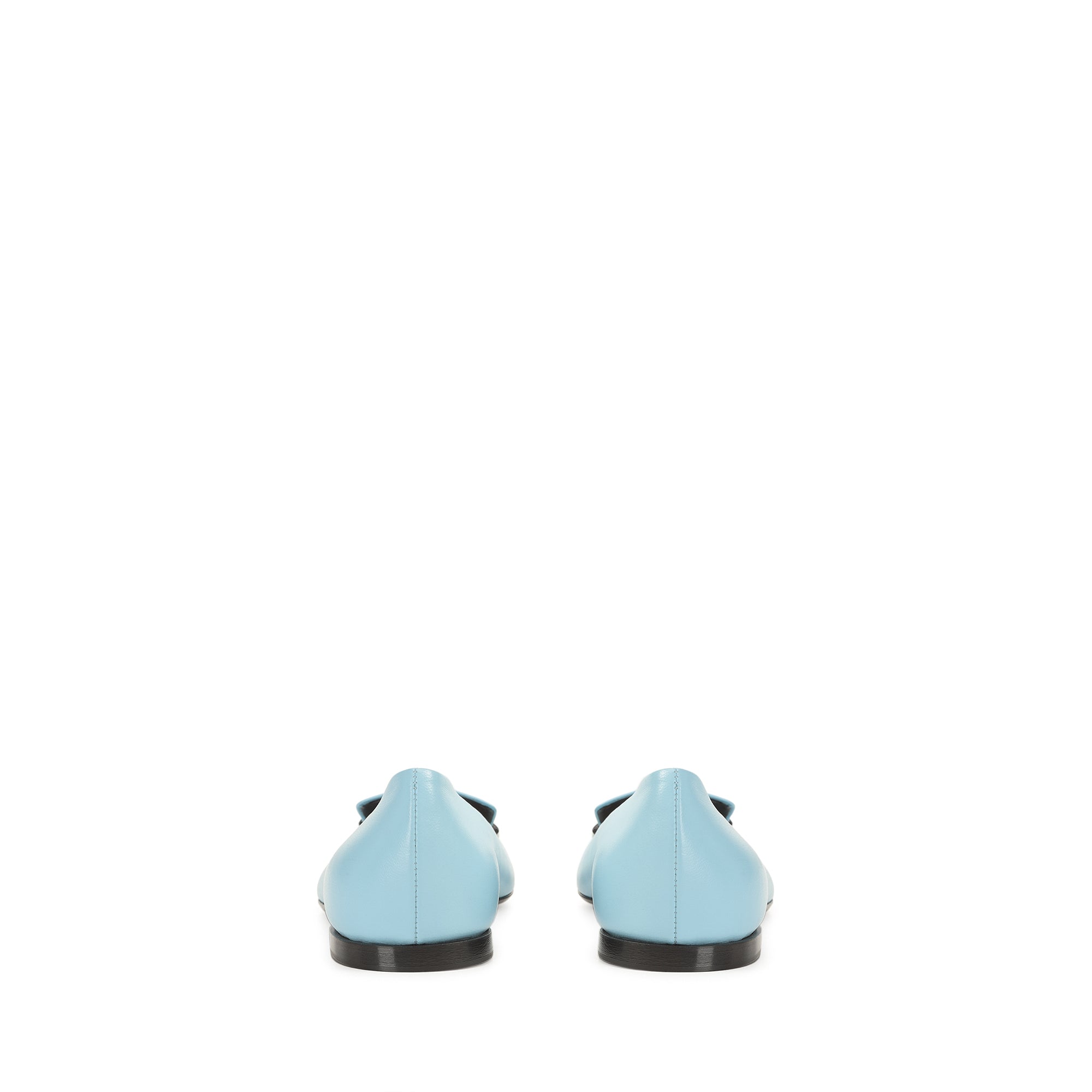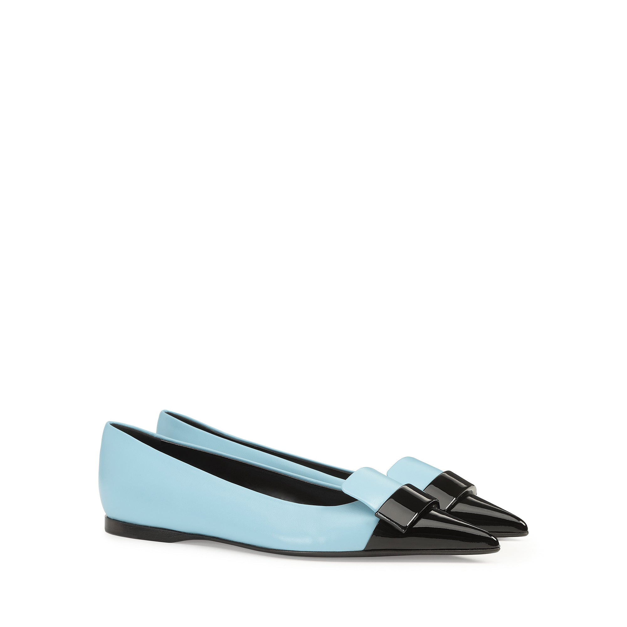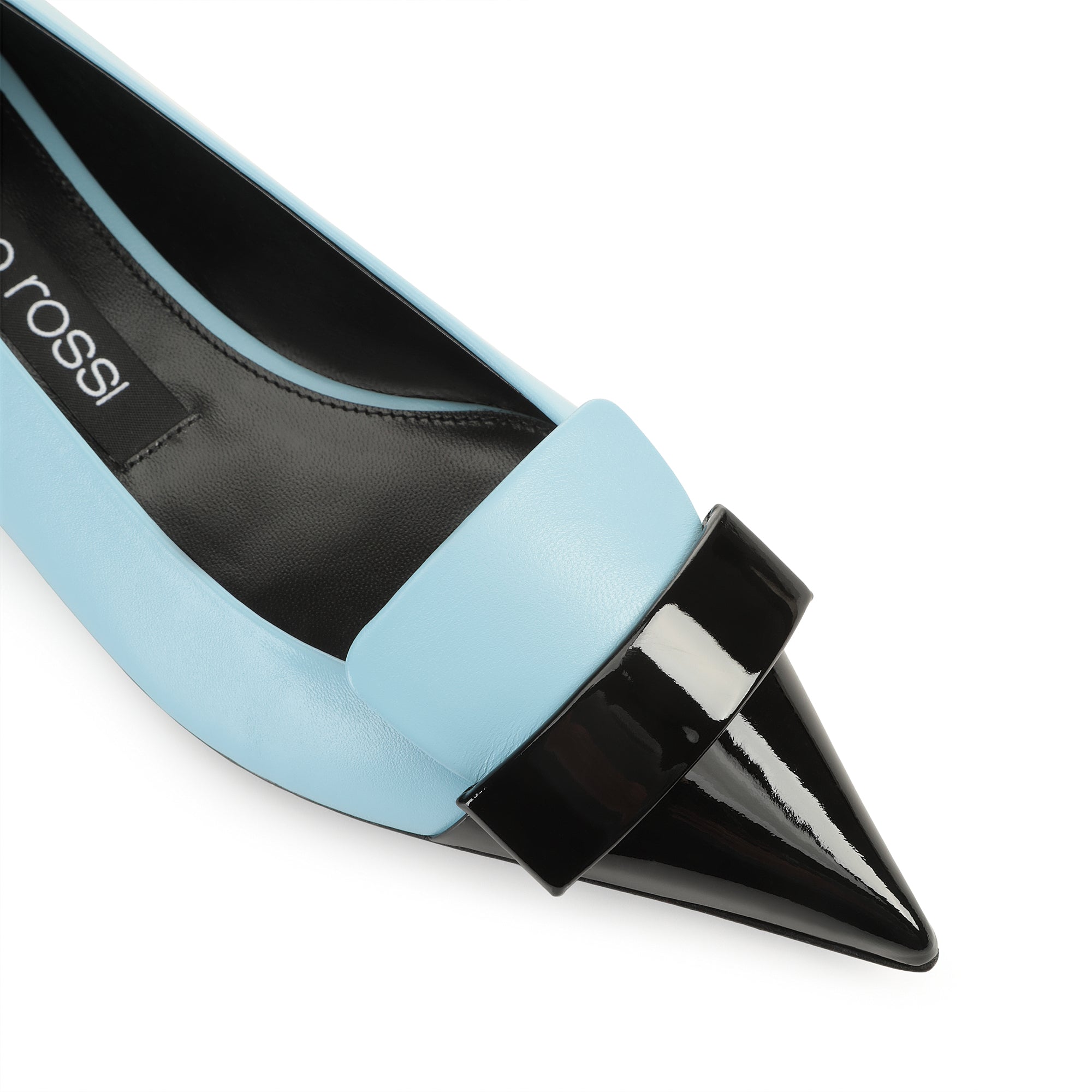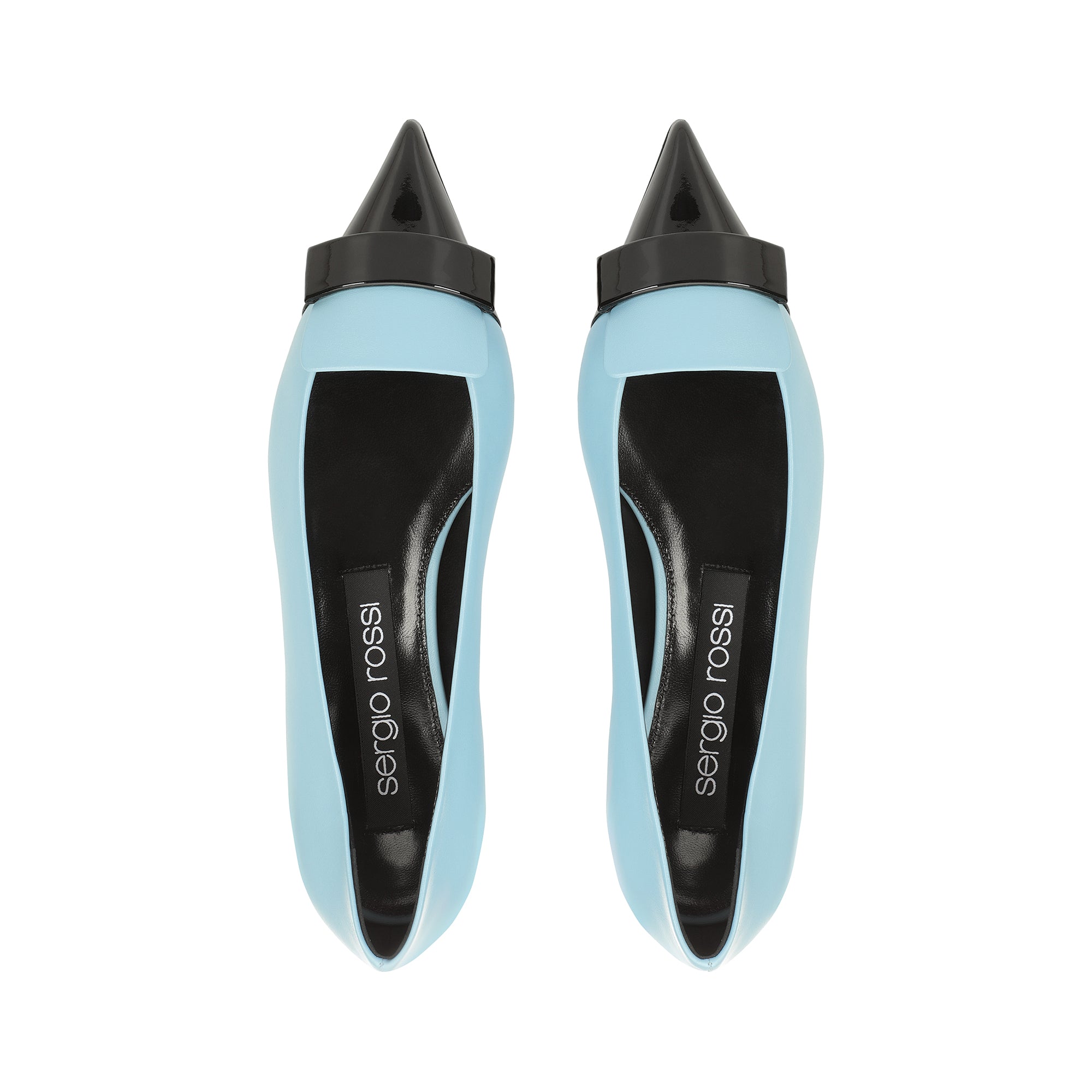 An icon from the archives, the sr1 ballet flats in two-tone patent leather feature a romantic light blue shade and a contrasting tapered black toe with matching plaque, for a style destined to set trends.