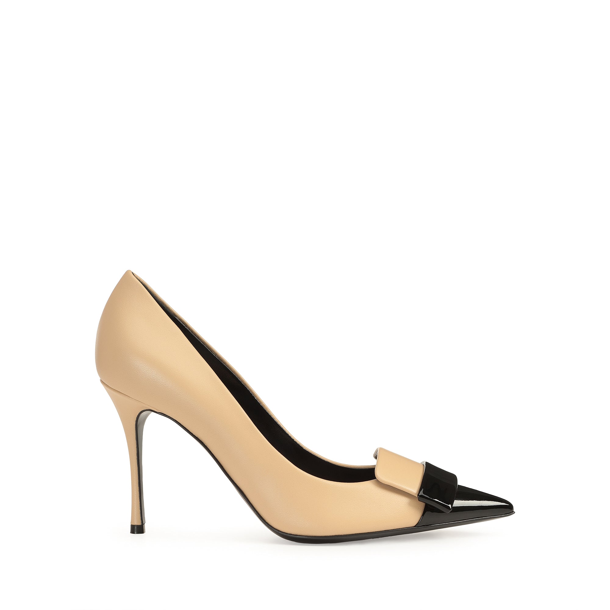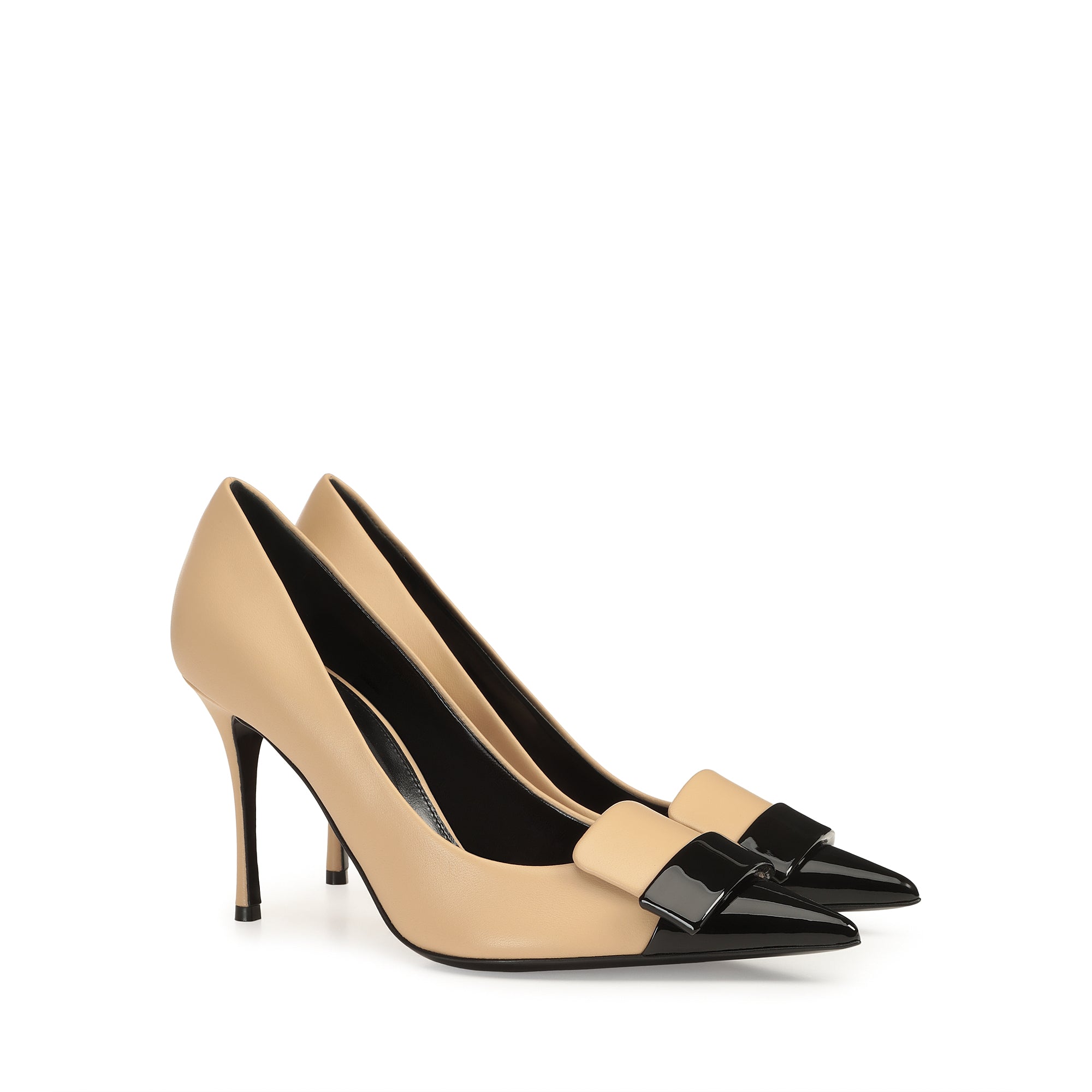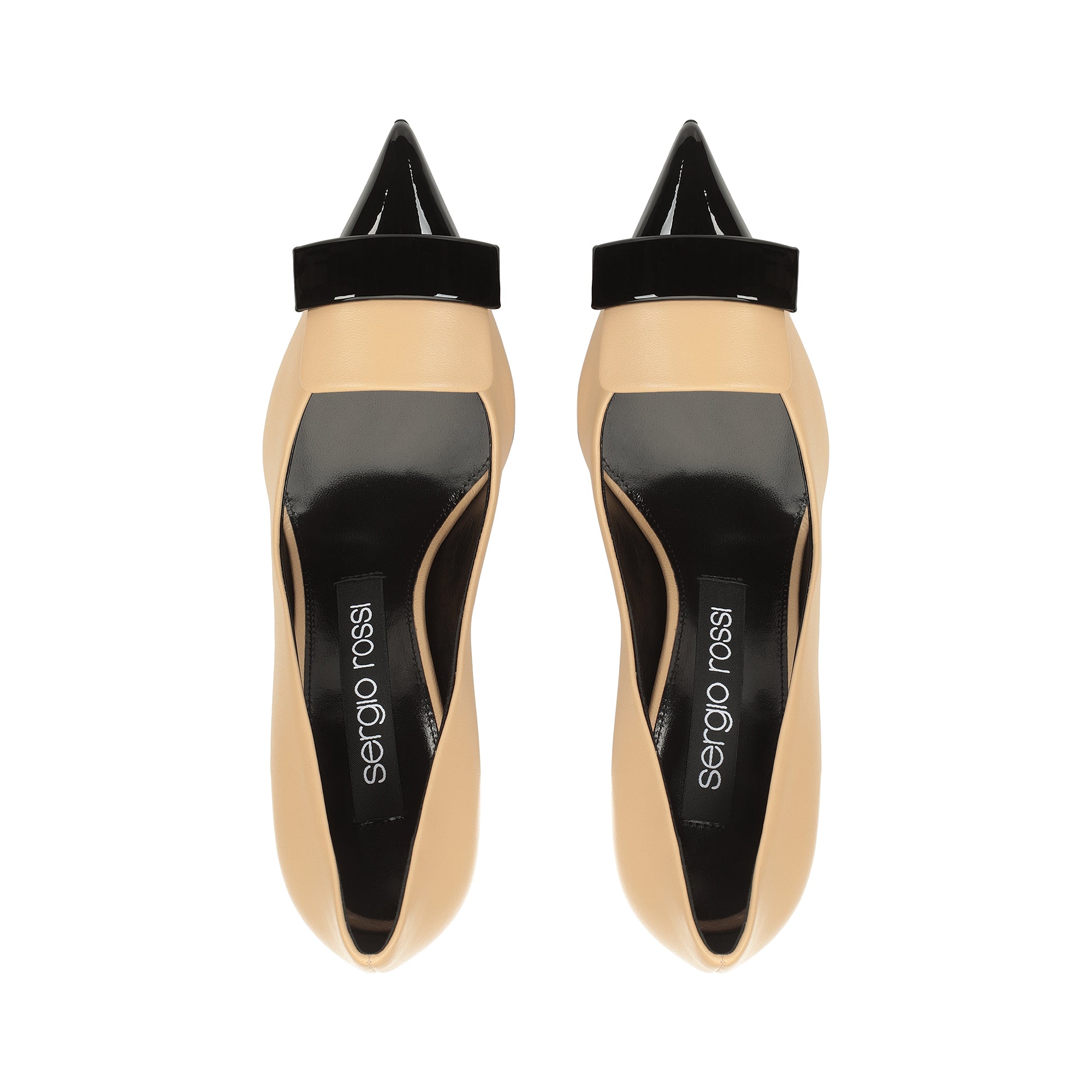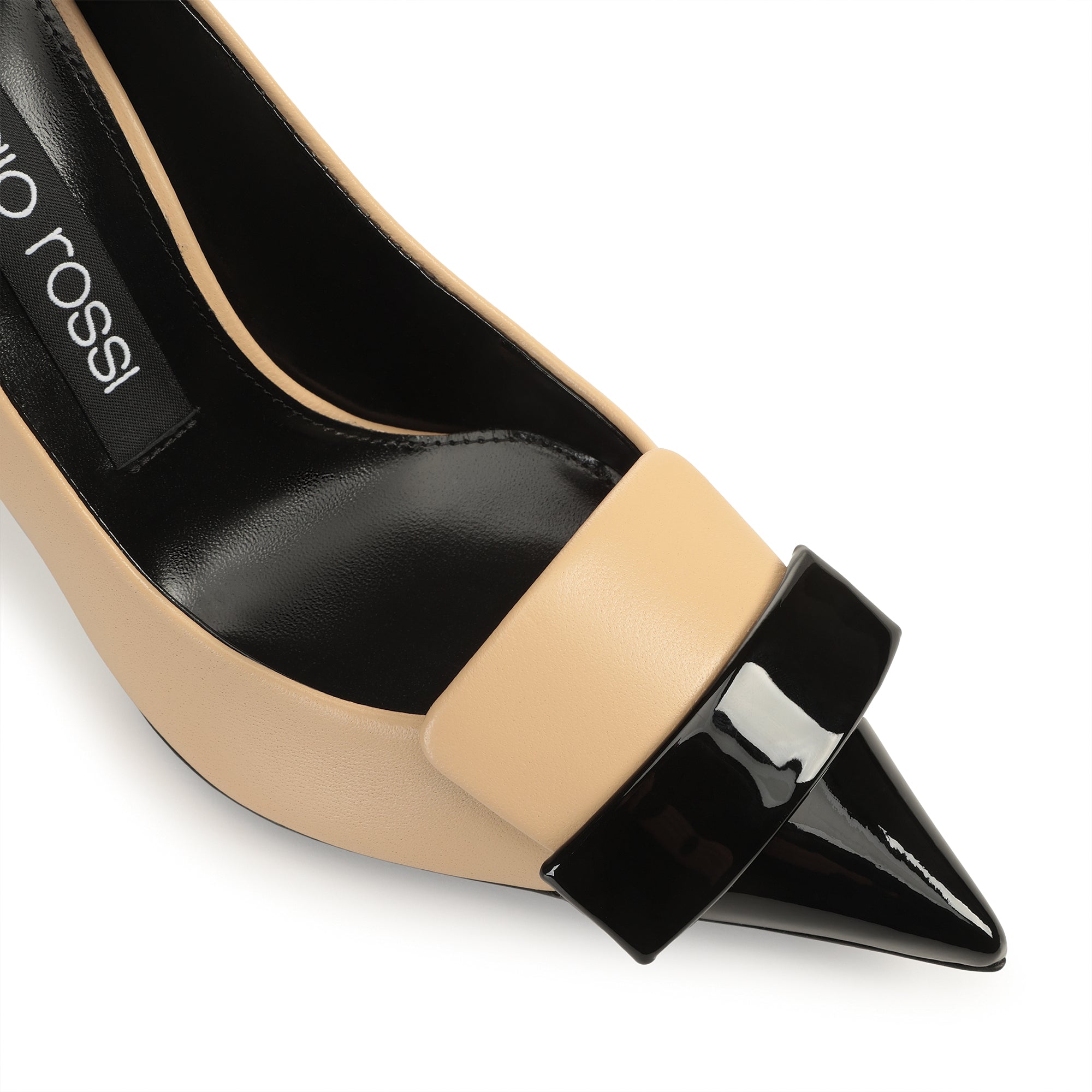 Elegance and personality combined, these sr1 pumps in beige leather feature an original two-tone design. A contrasting toe and plaque in black patent leather create an unexpected interplay of reflections, for a distinctive femininity.