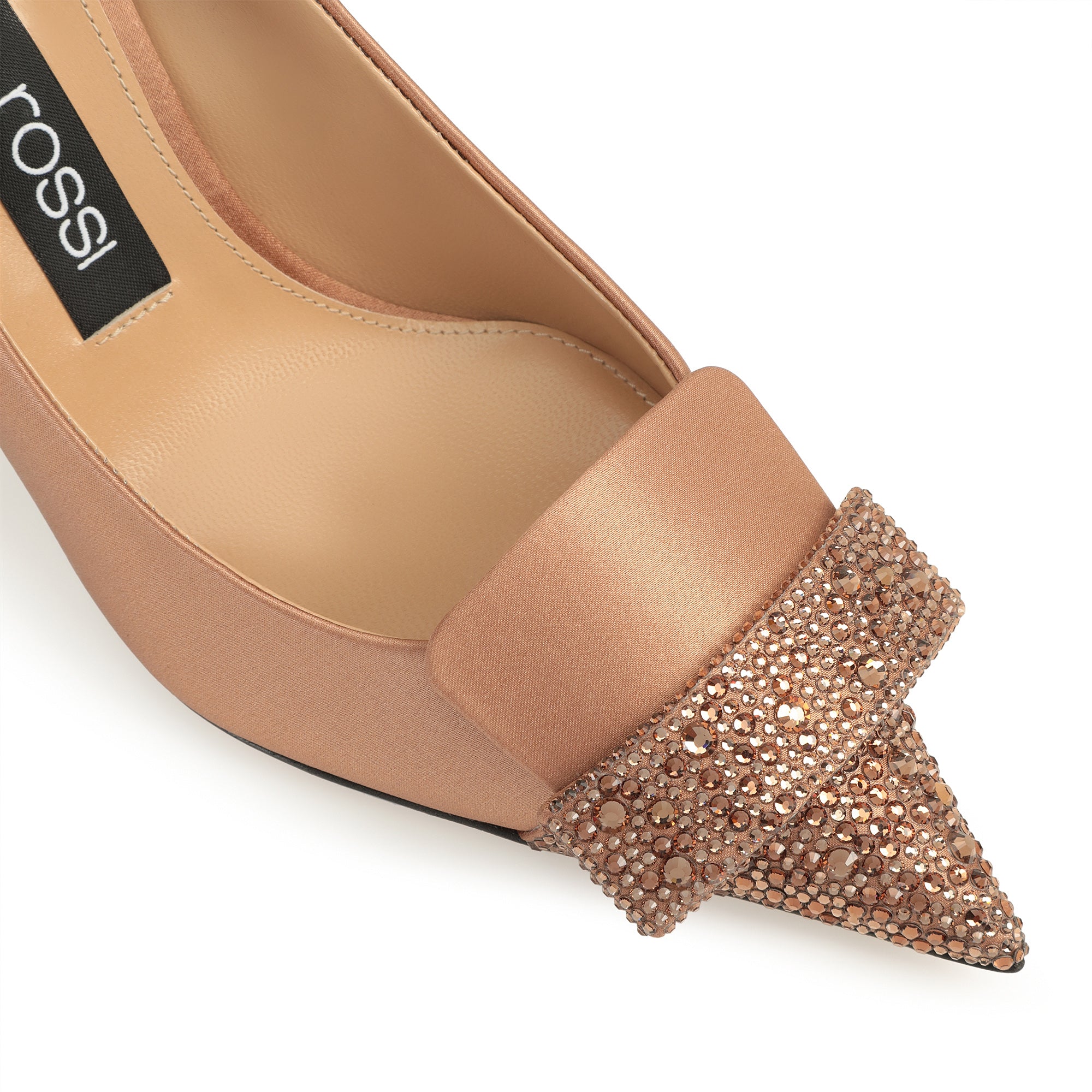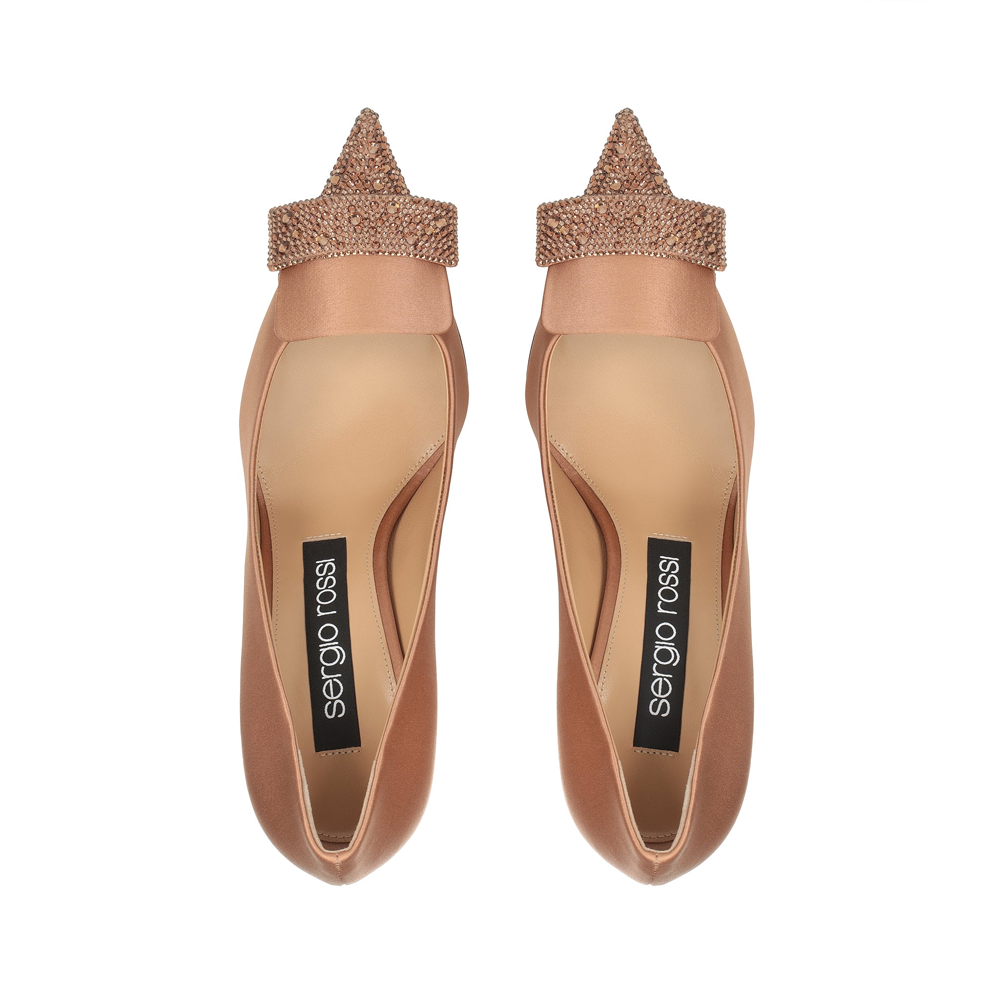 These sr1 pumps with a slim heel exude refined femininity. The timeless elegance of their pink-beige satin meets a precious matching micro-pavé of crystals, illuminating the plaque and tapered toe. A staple for those who love to shine on the most special occasions.
