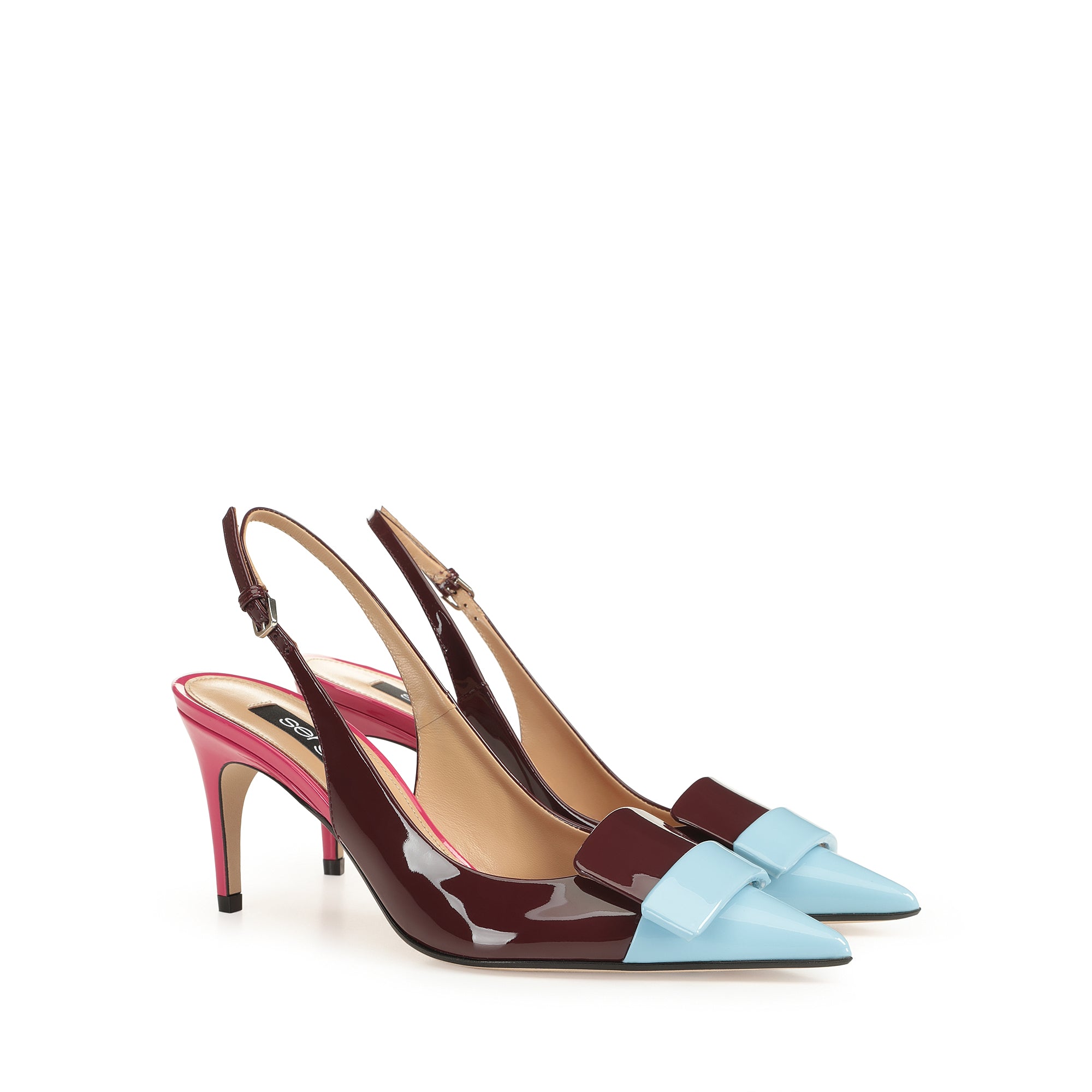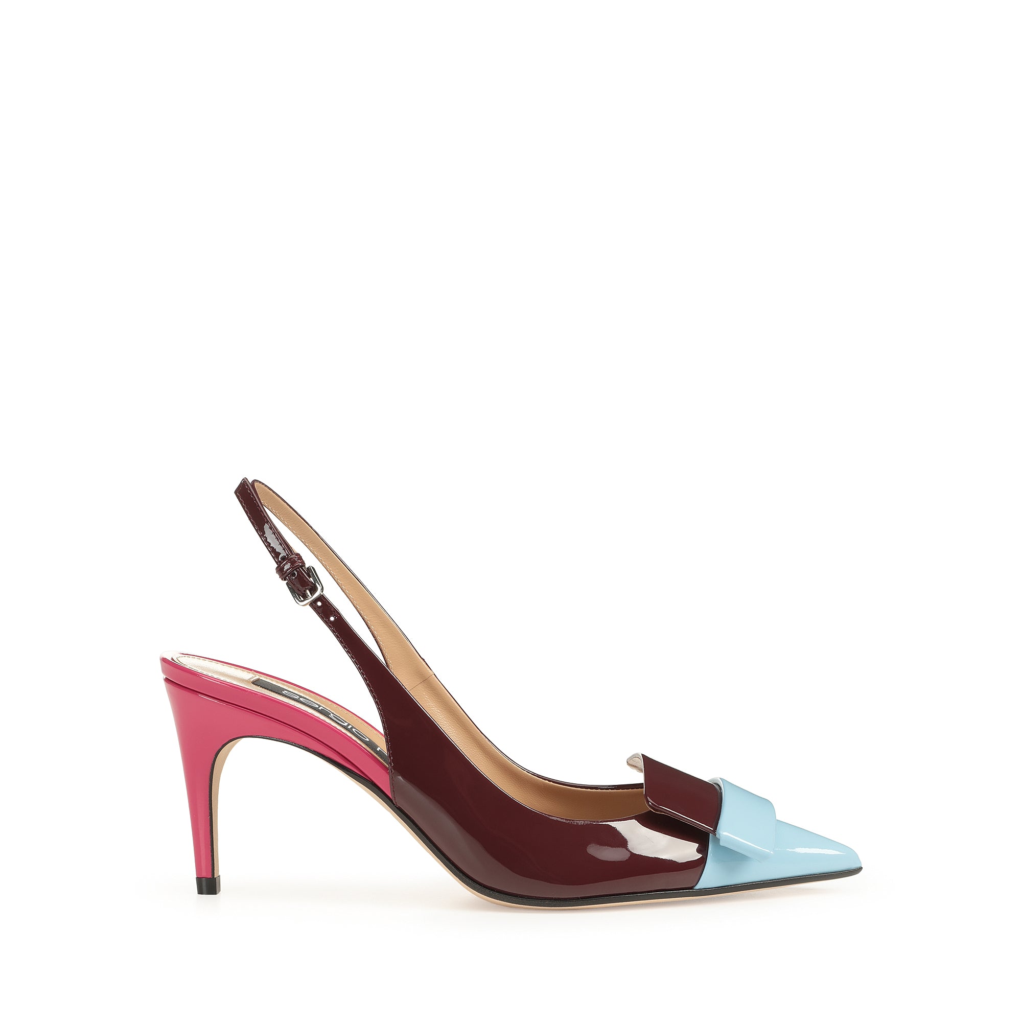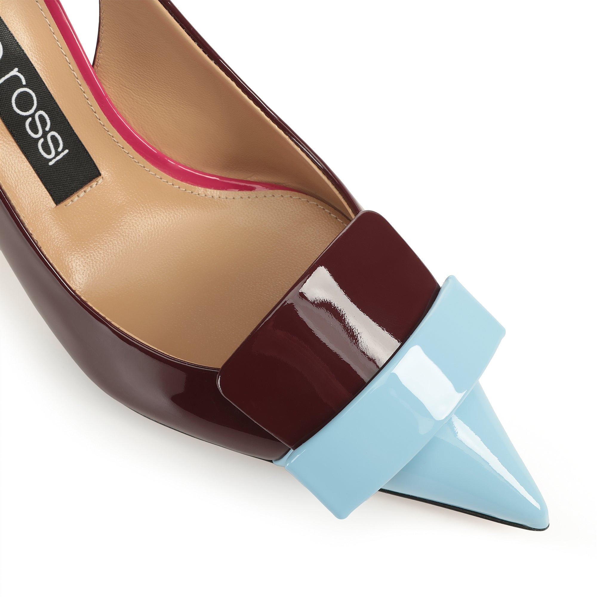 Featuring an original design in fuchsia, burgundy, and light blue patent leather, these sr1 slingbacks revisit a brand icon in a contemporary key. Their sensual silhouette, with a matching plaque and toe, reflects the personality of those looking for a distinctive style.