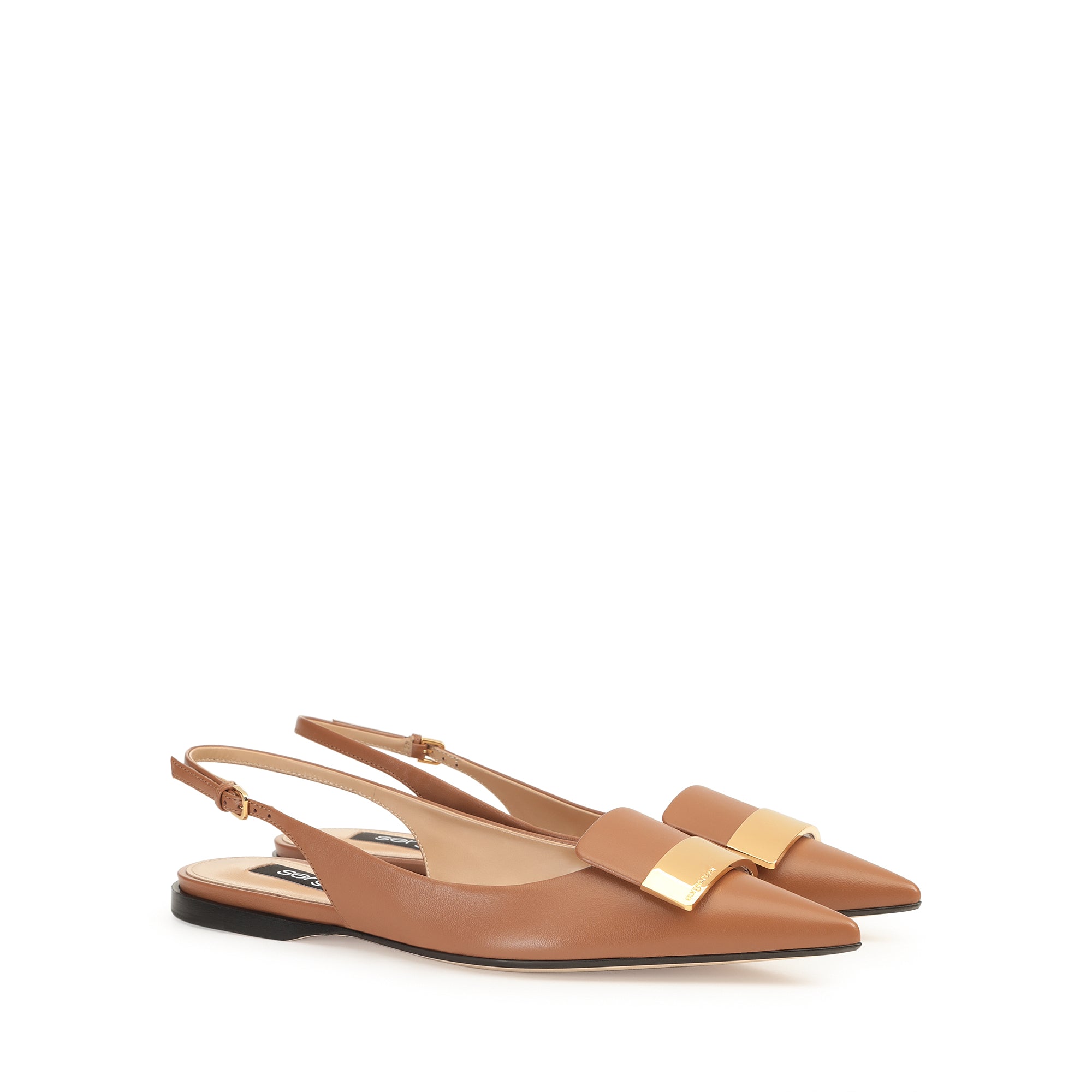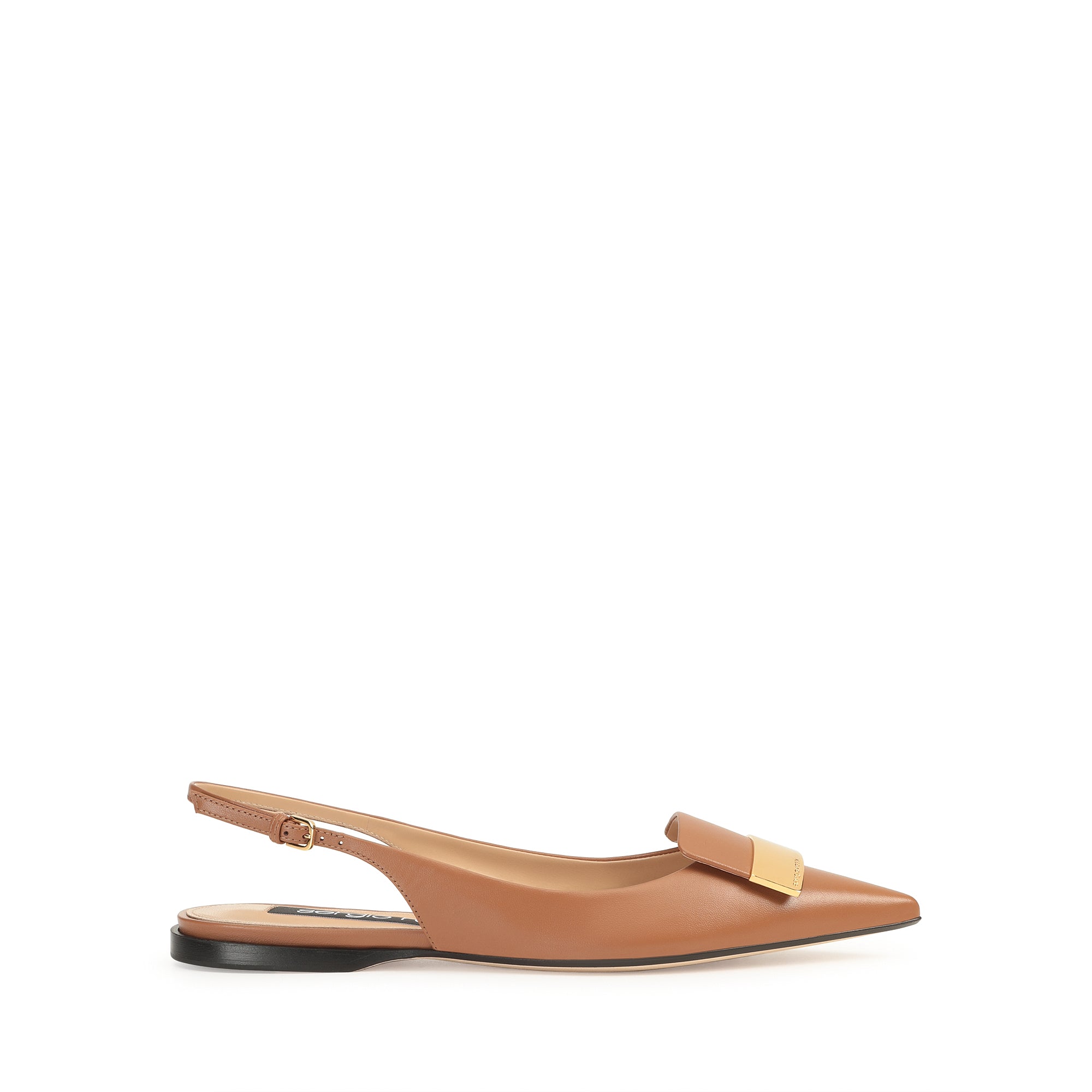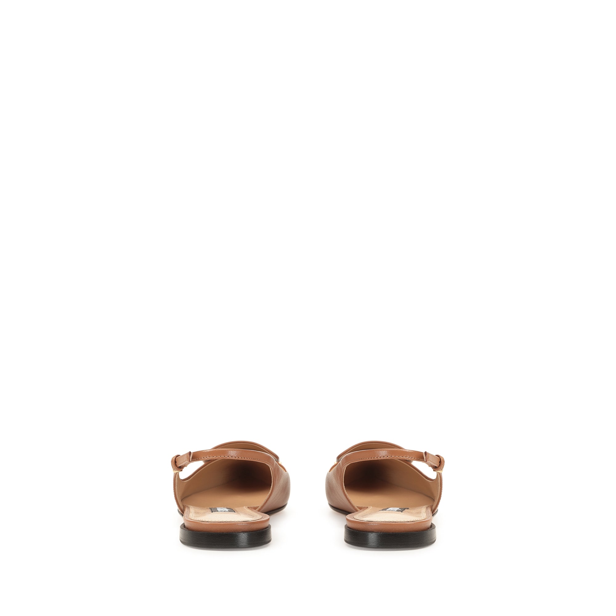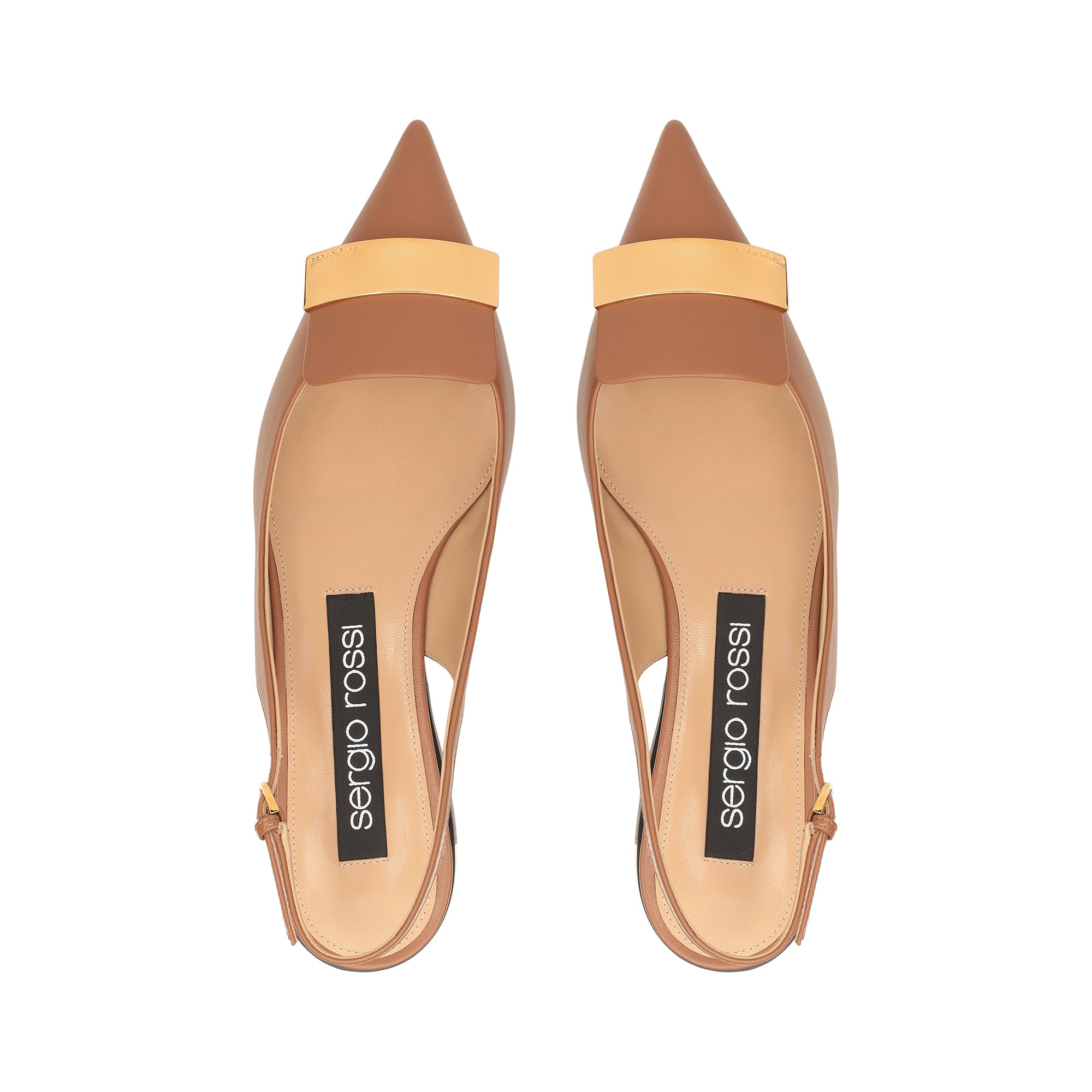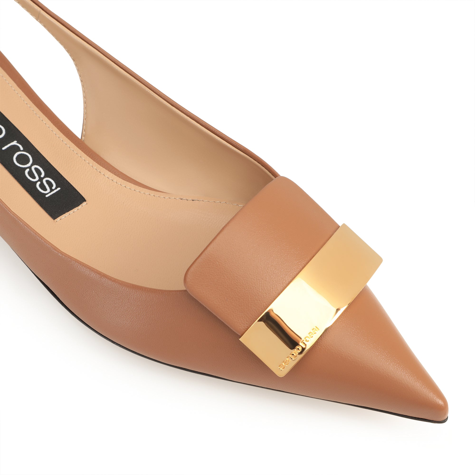 These flat sr1 slingbacks in light brown leather exude refined femininity. The tapered toe of their sleek silhouette is embellished with a precious gold plaque, for a look that’s always in step with the contemporary woman.