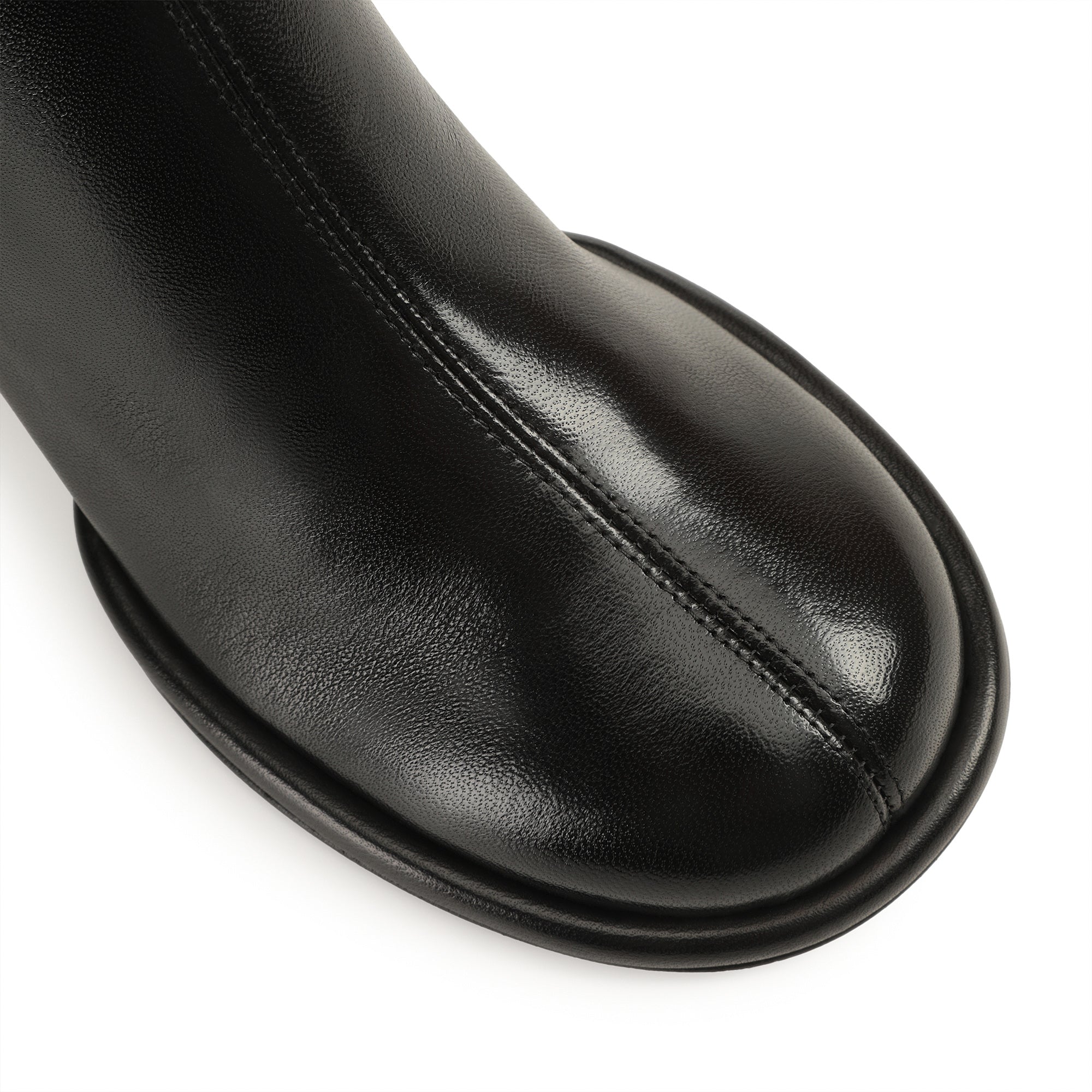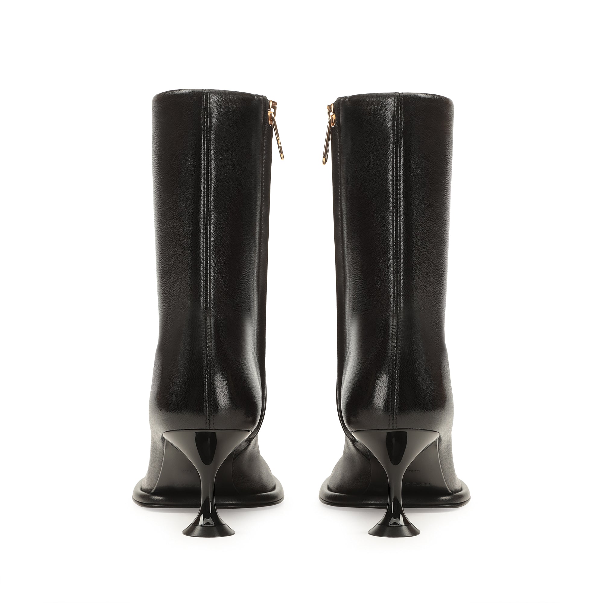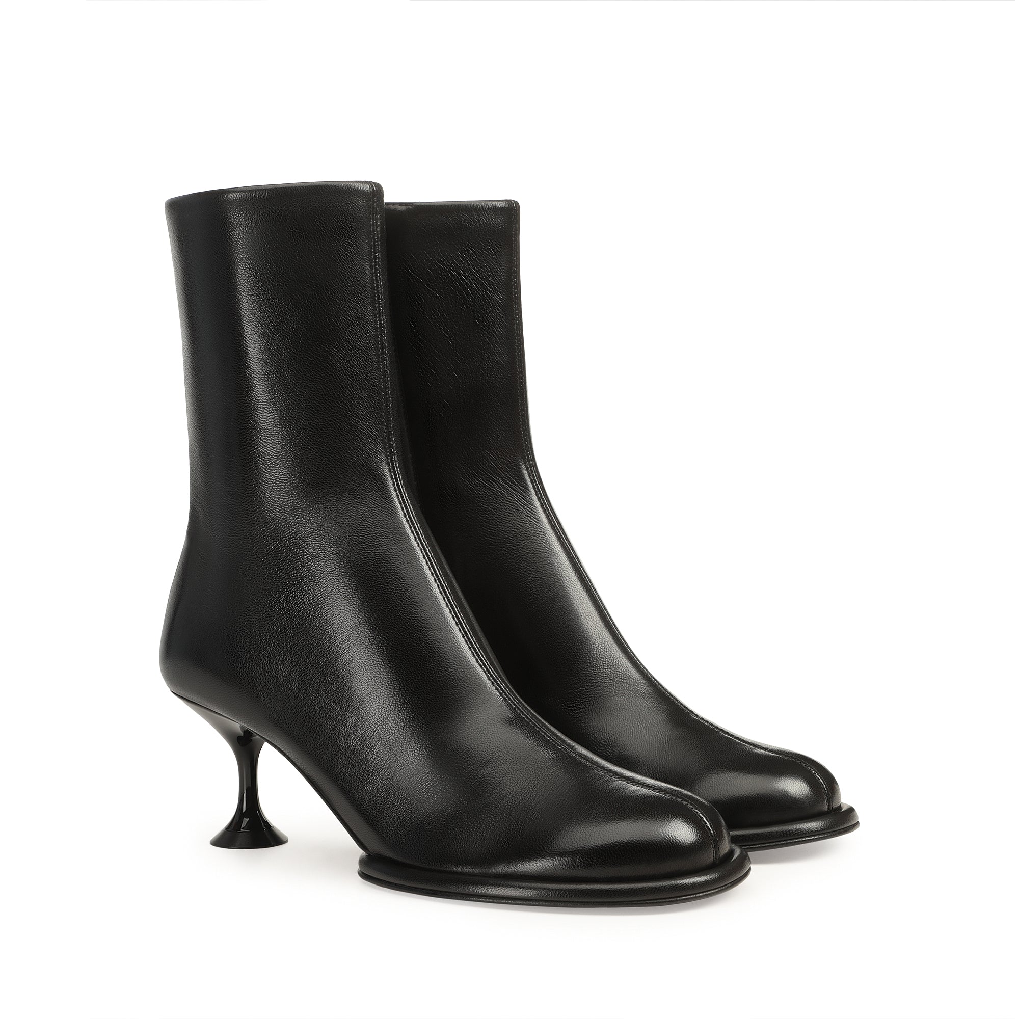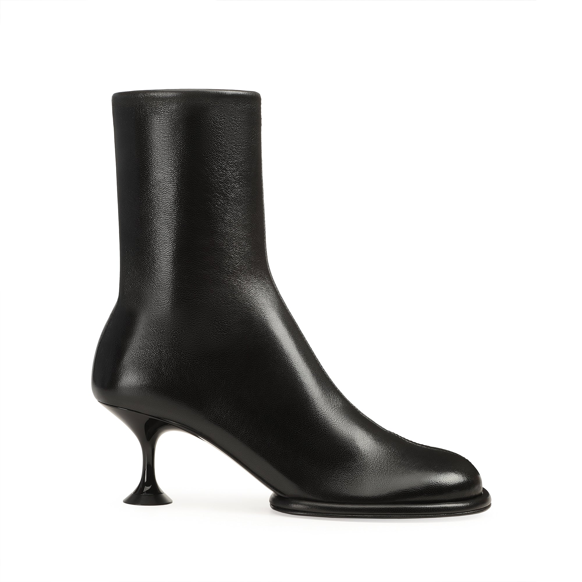 Orb booties in soft black stretch leather. The design features a round toe and martini heel.