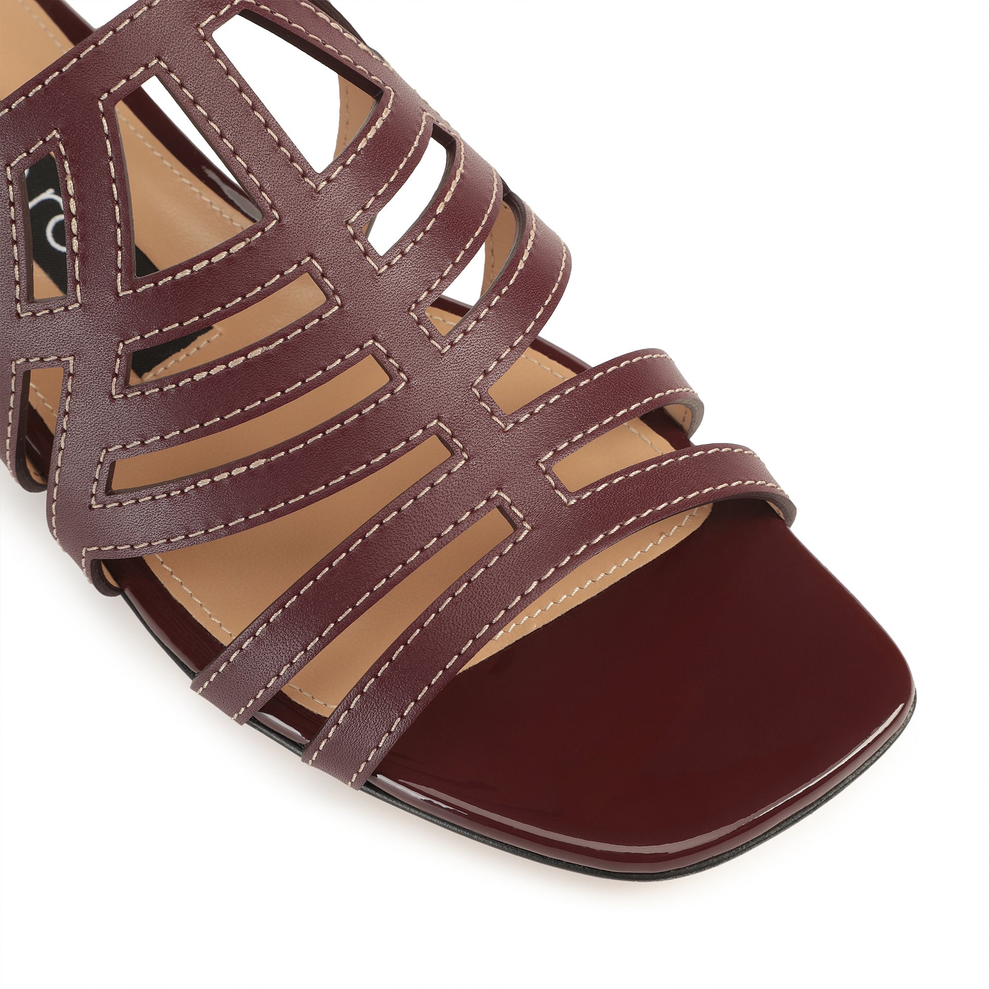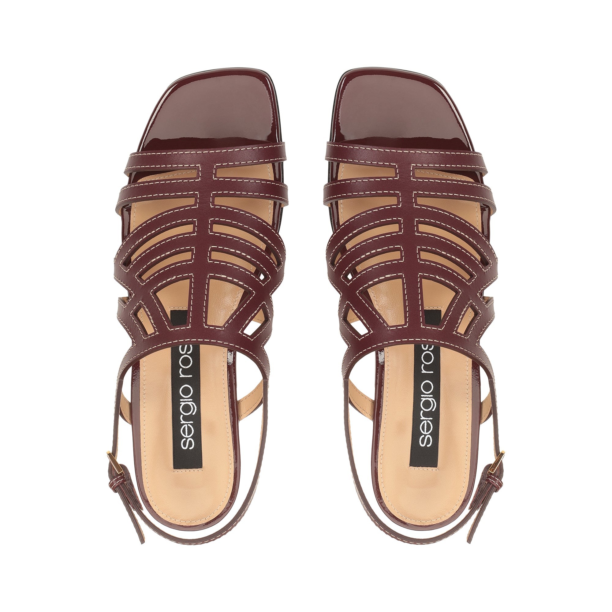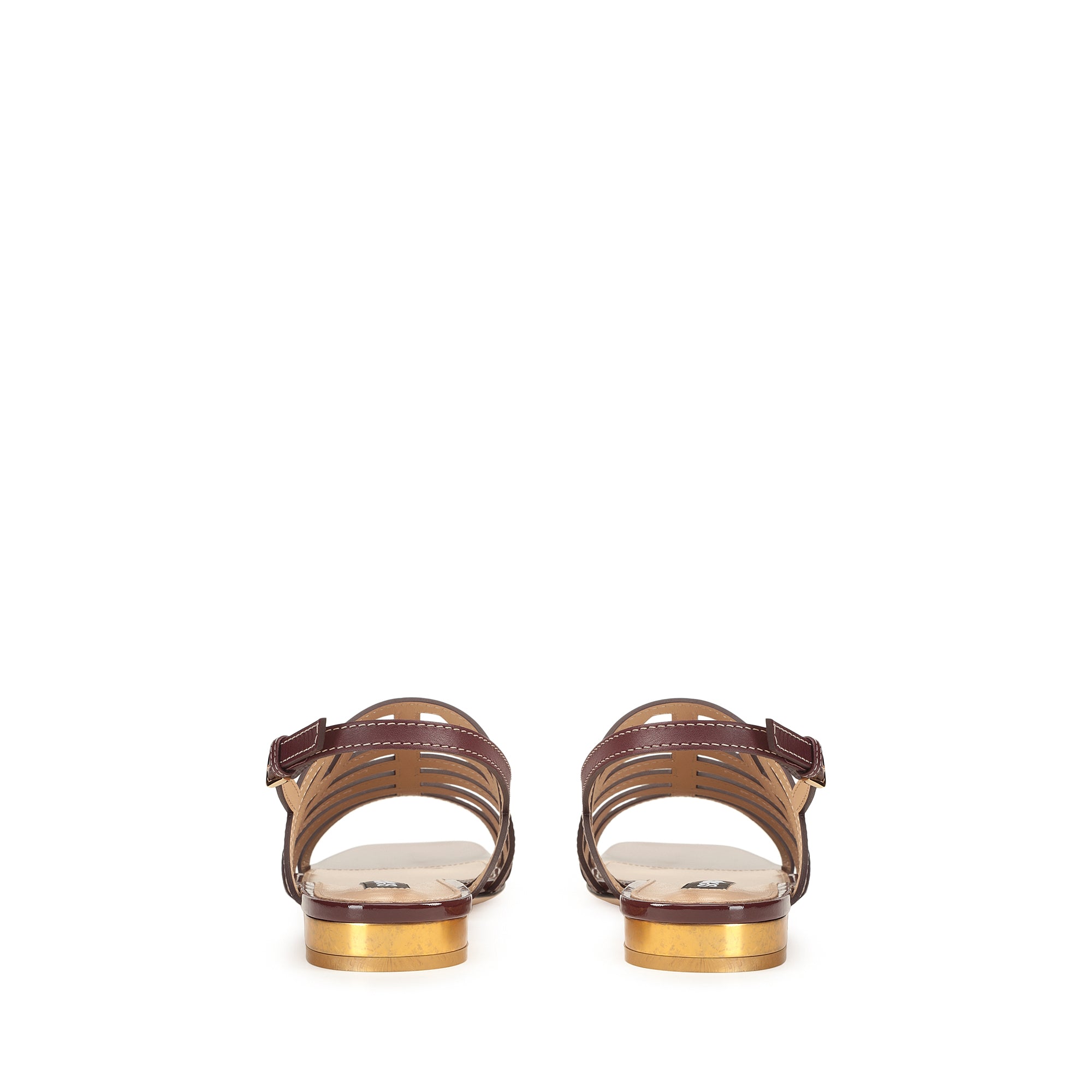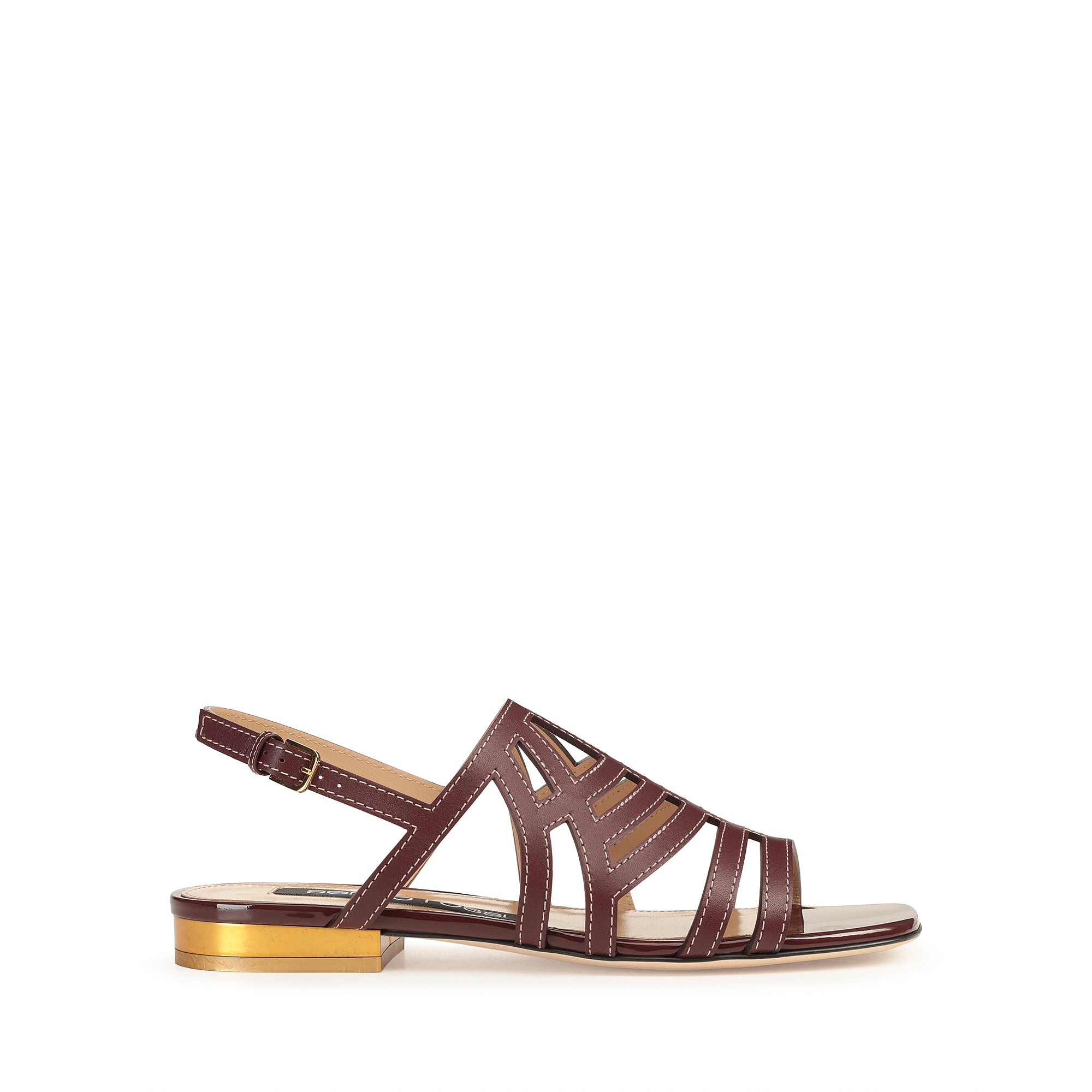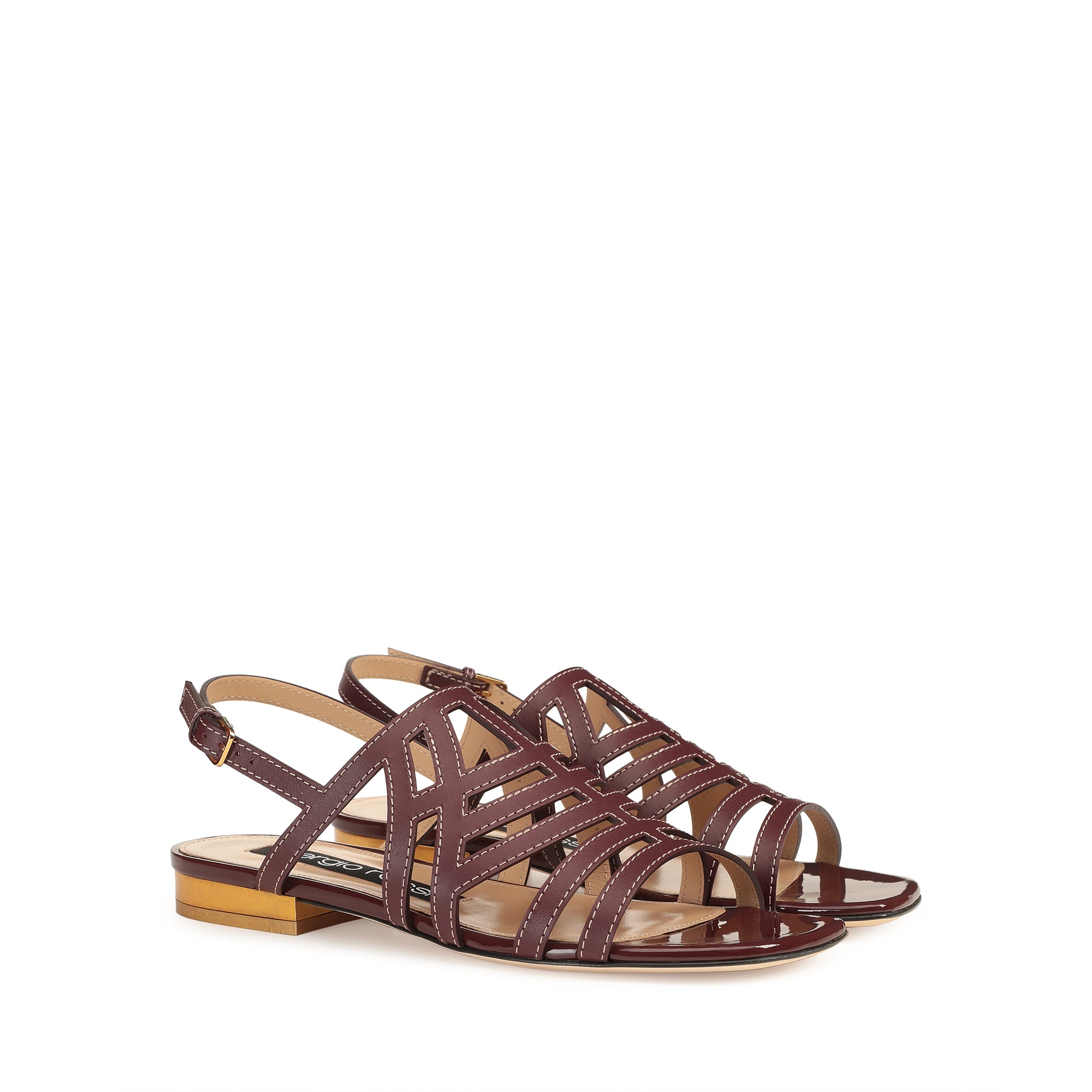 These graphic sr Agate sandals come in burgundy shiny and patent leather. A gold heel adds an original twist, for expressing an assertive femininity during the season’s casual occasions.