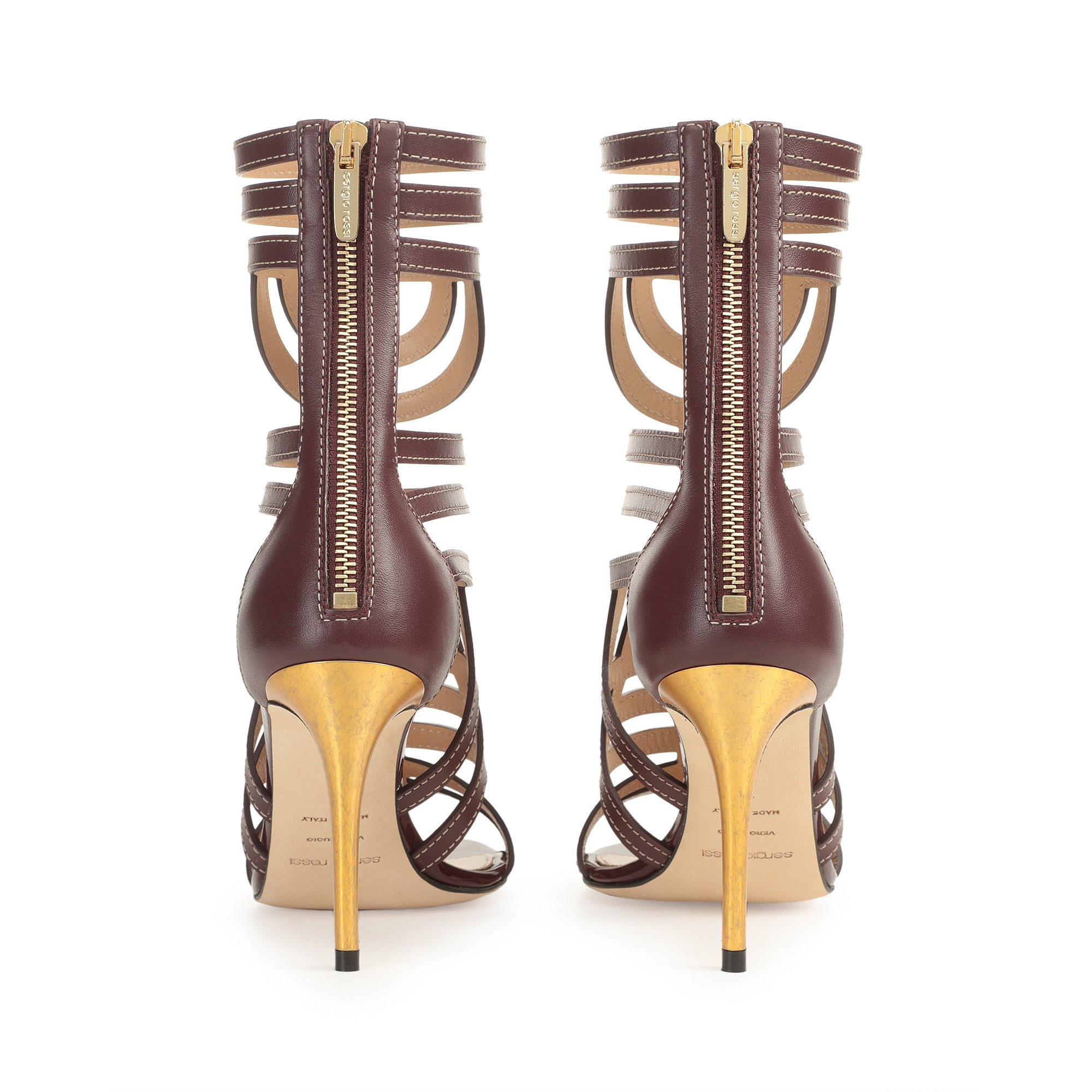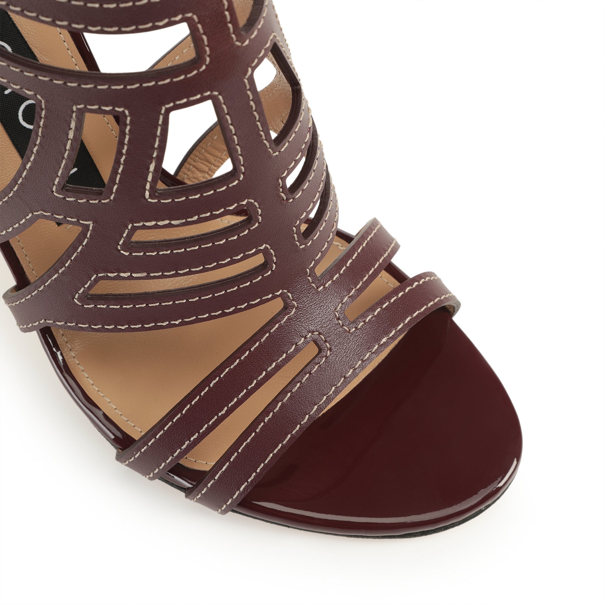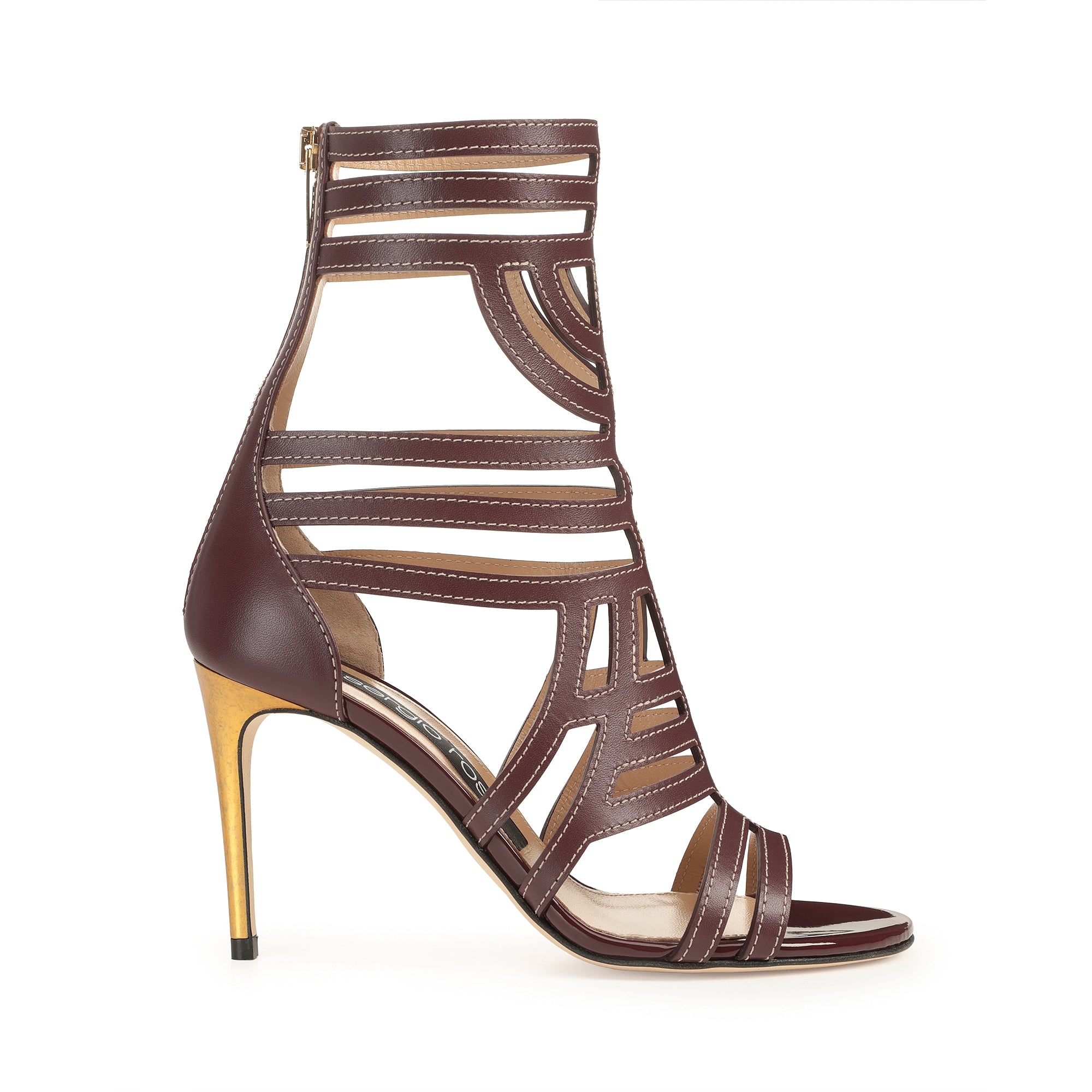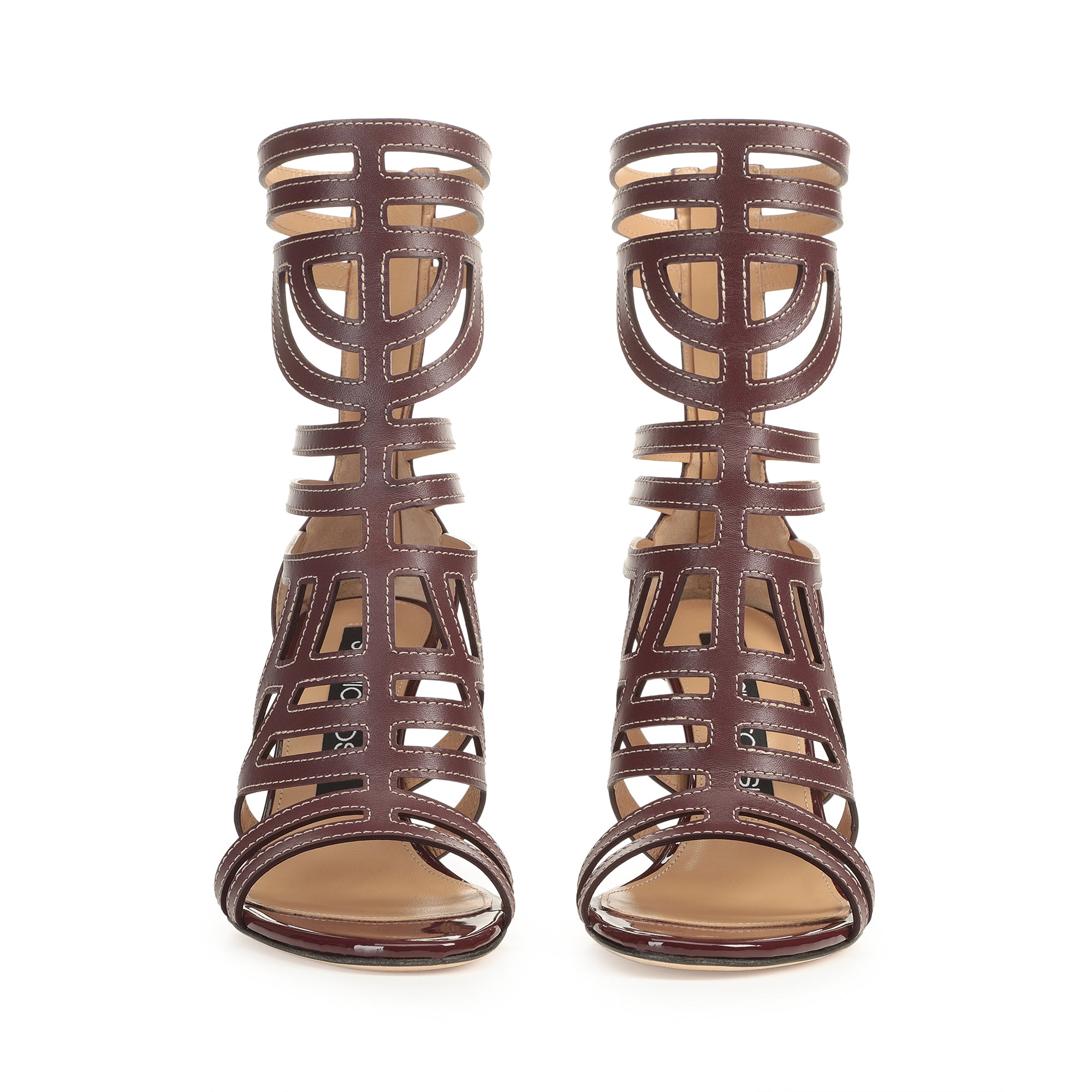 These graphic sr Agate sandals come in burgundy shiny and patent leather. Their maze-like structure with contrast stitching creates an elegant interwoven effect, while a thin gold heel adds a striking twist. For bold, unstoppable femininity.