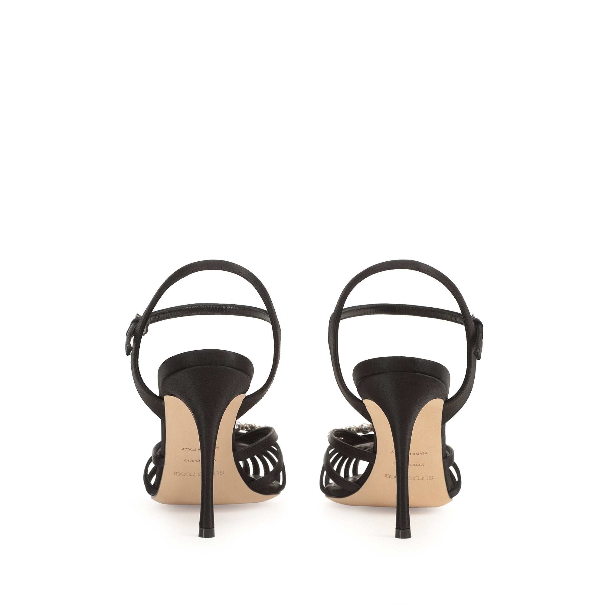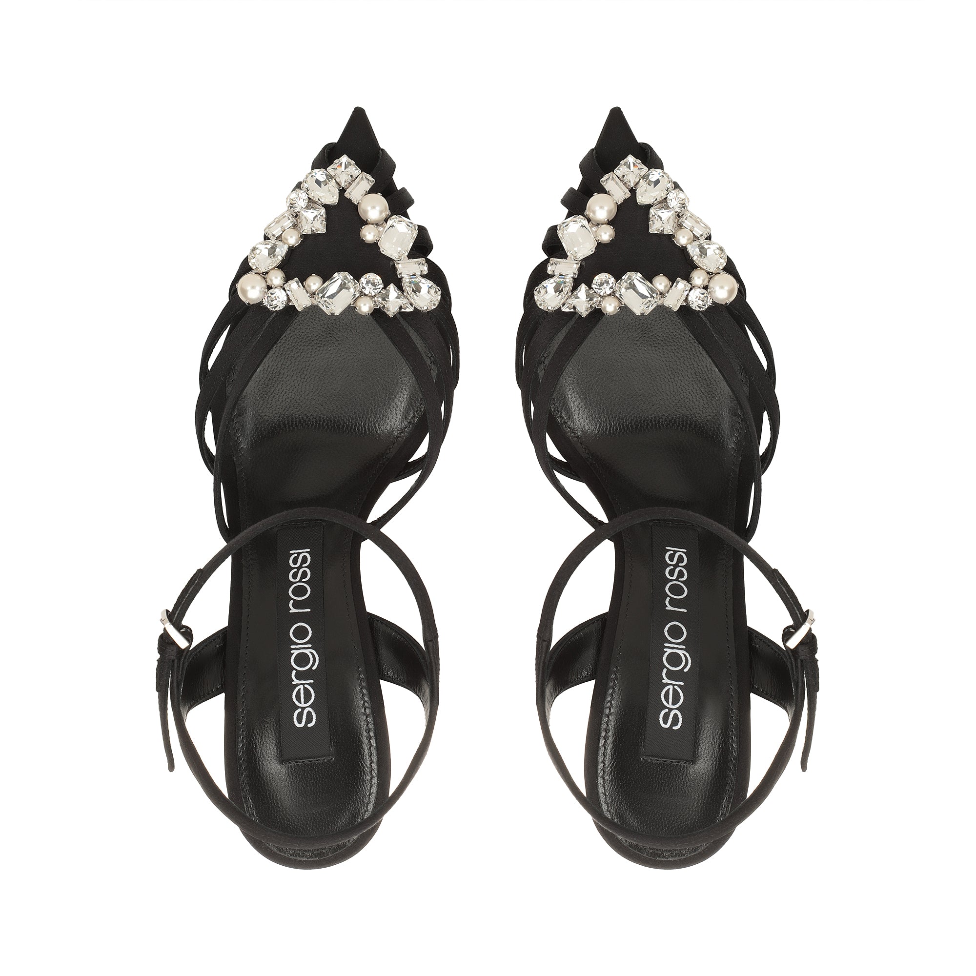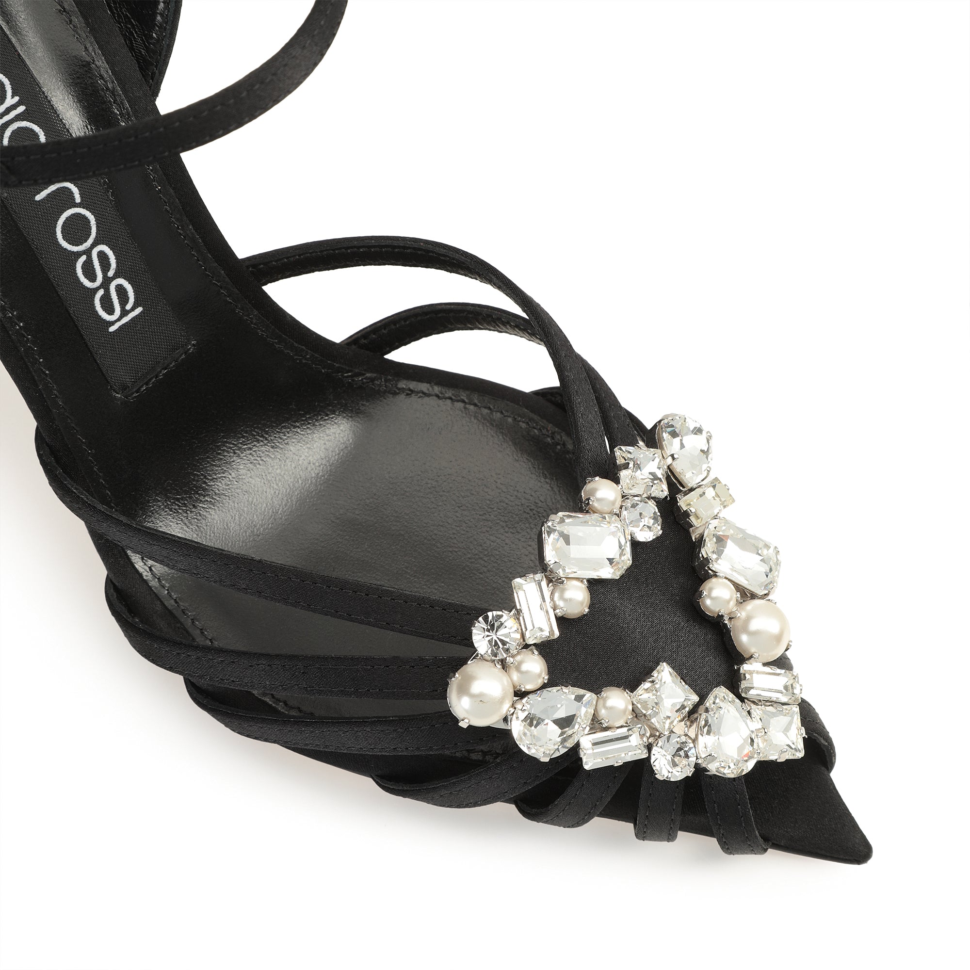 These sr Godiva Precious sandals in black satin offer scintillating allure. Their cage design features delicate straps and an embellishment set with crystals and pearls of different sizes, which mirrors the shape of their tapered toe with elegance. A slim high heel adds the finishing touch, for precious femininity on the most special occasions.