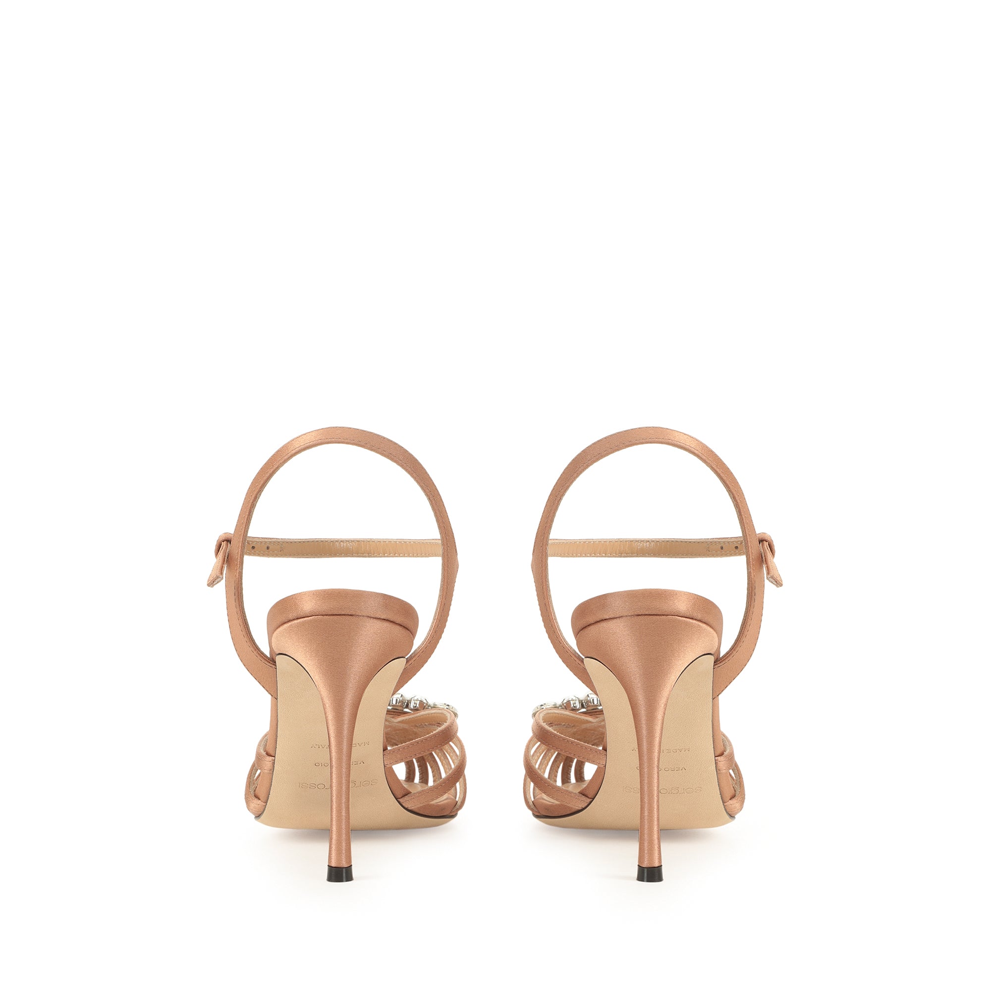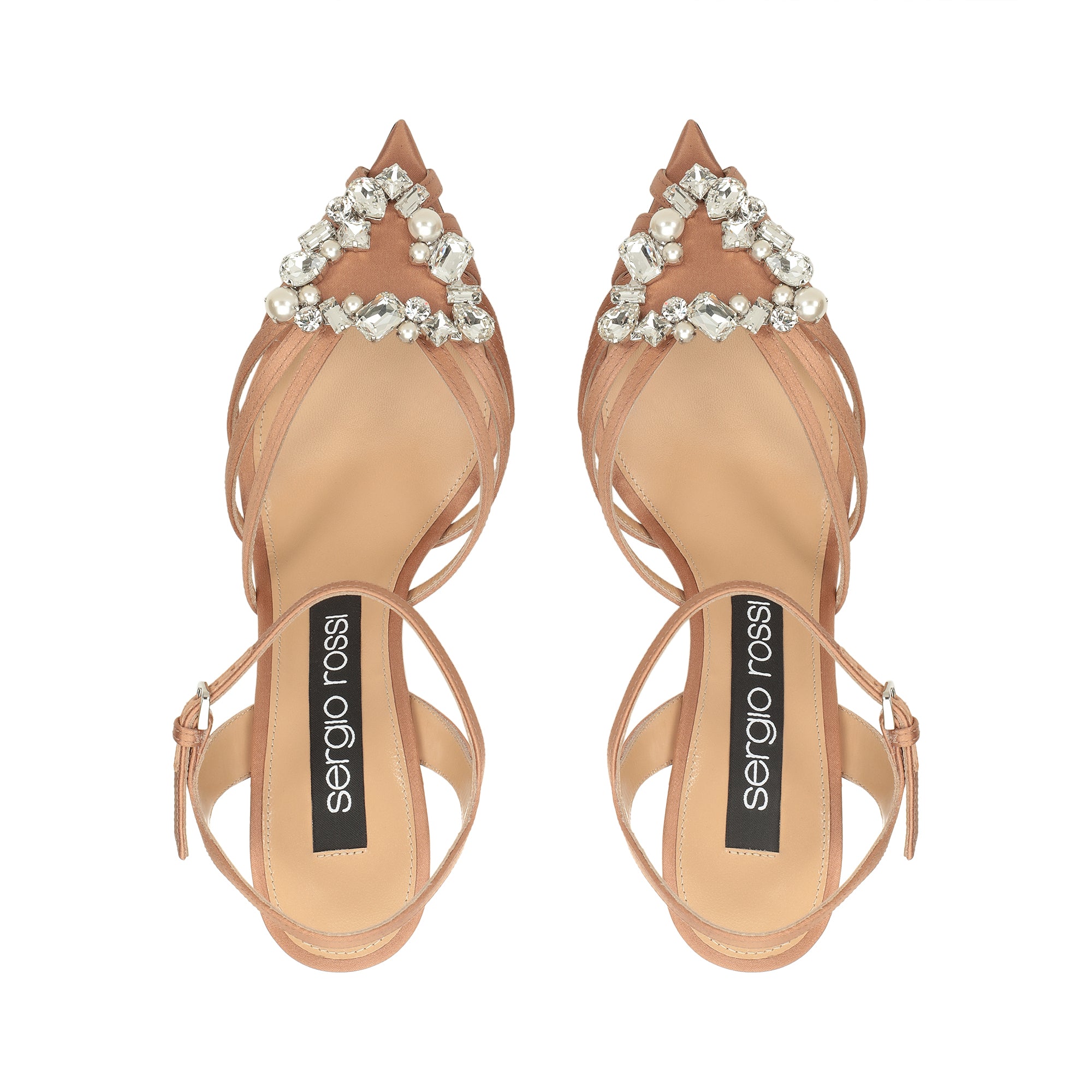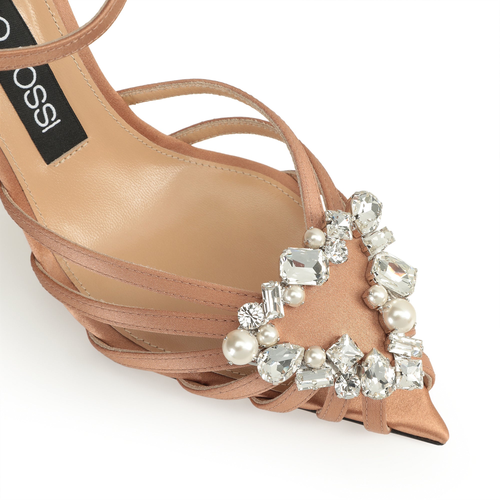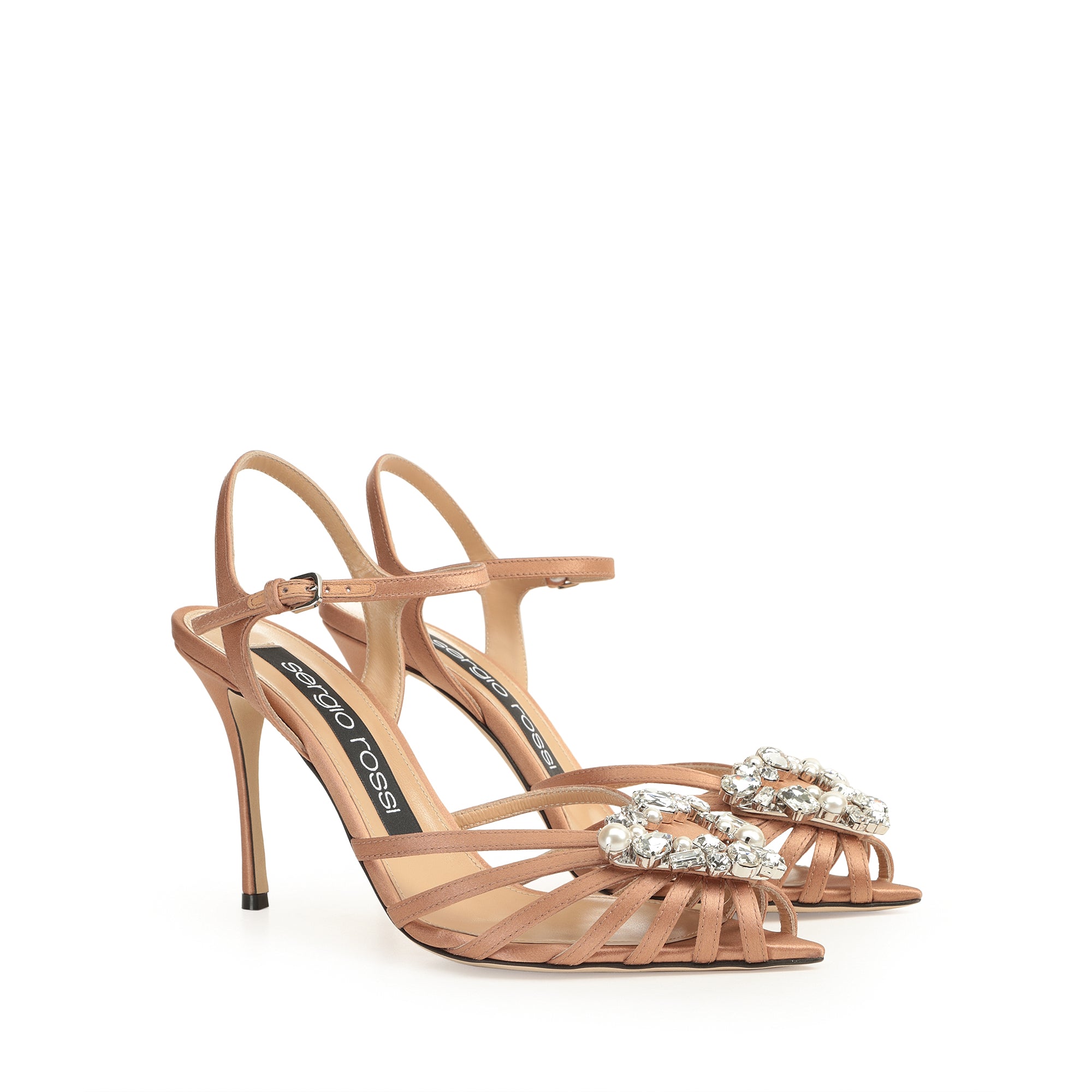 A symbol of authentic femininity, these sr Godiva Precious sandals come in a pink-beige satin for injecting fresh elegance into special occasions. Their sunburst design features delicate thin straps and a precious embellishment of differently sized crystals and pearls framing their tapered toe. For a style destined to be remembered.