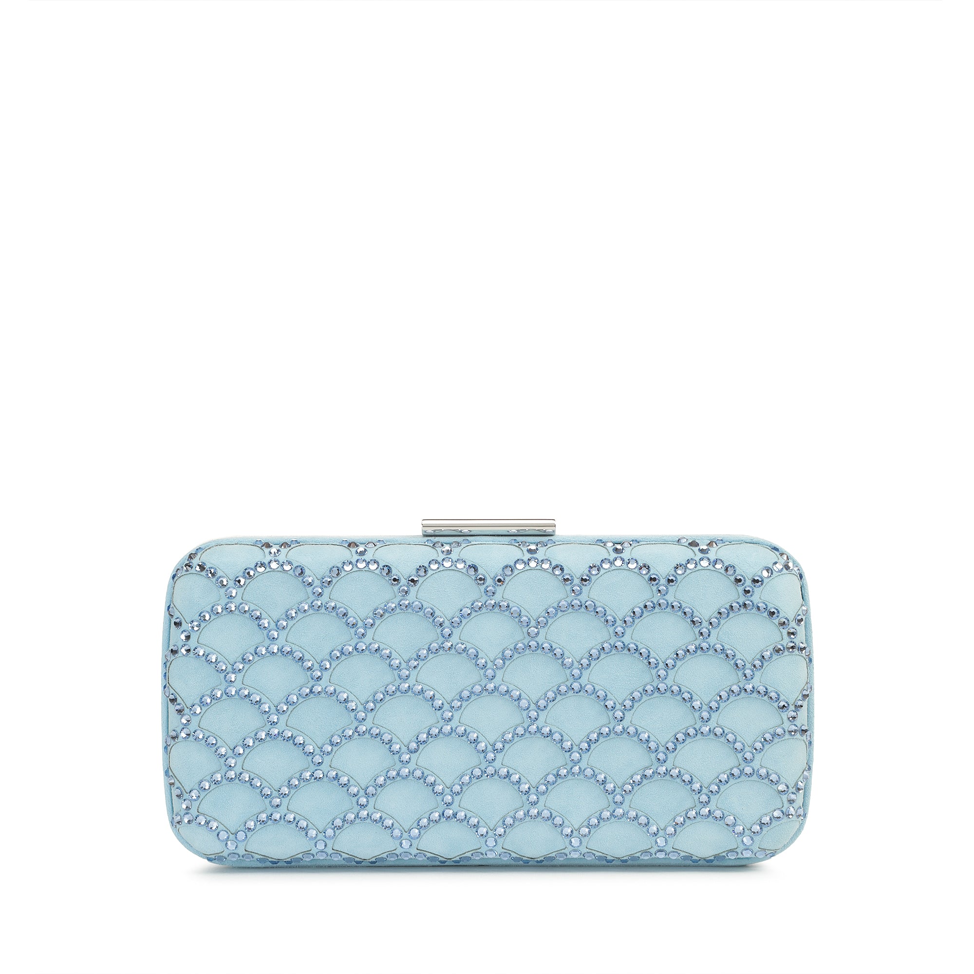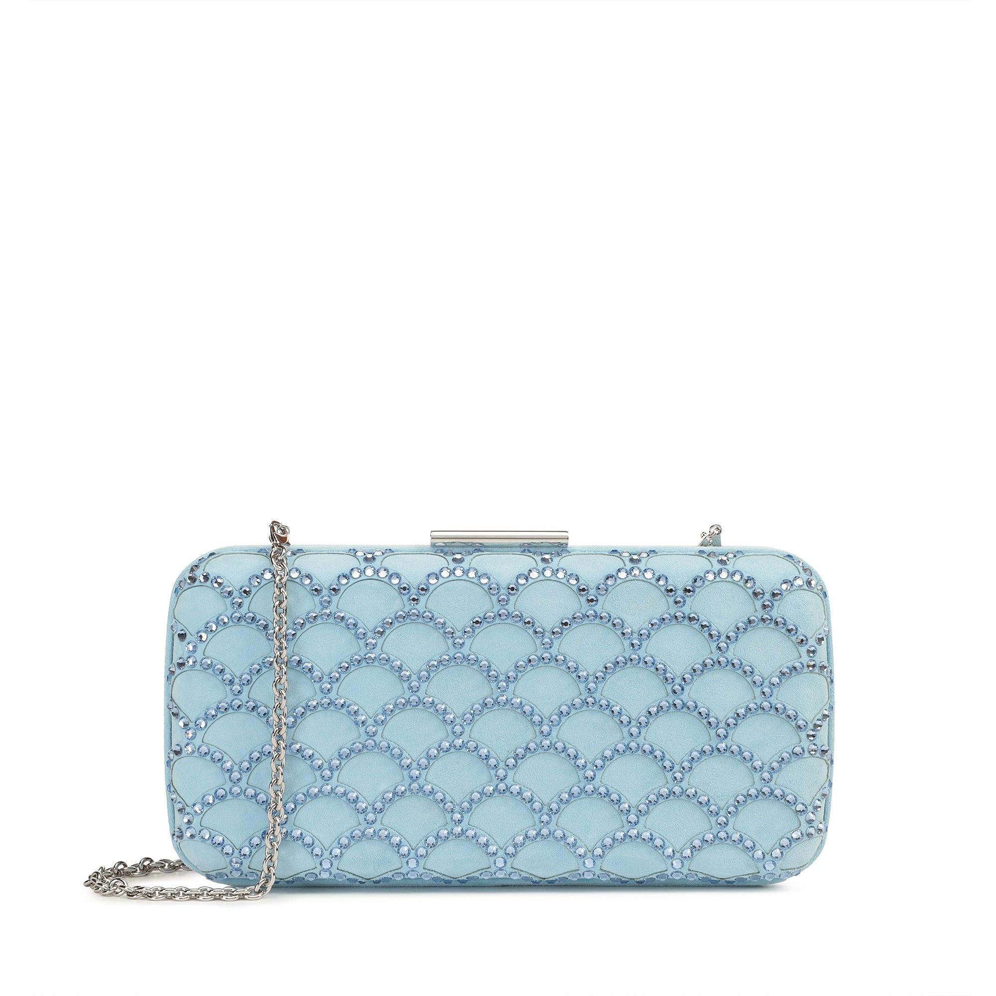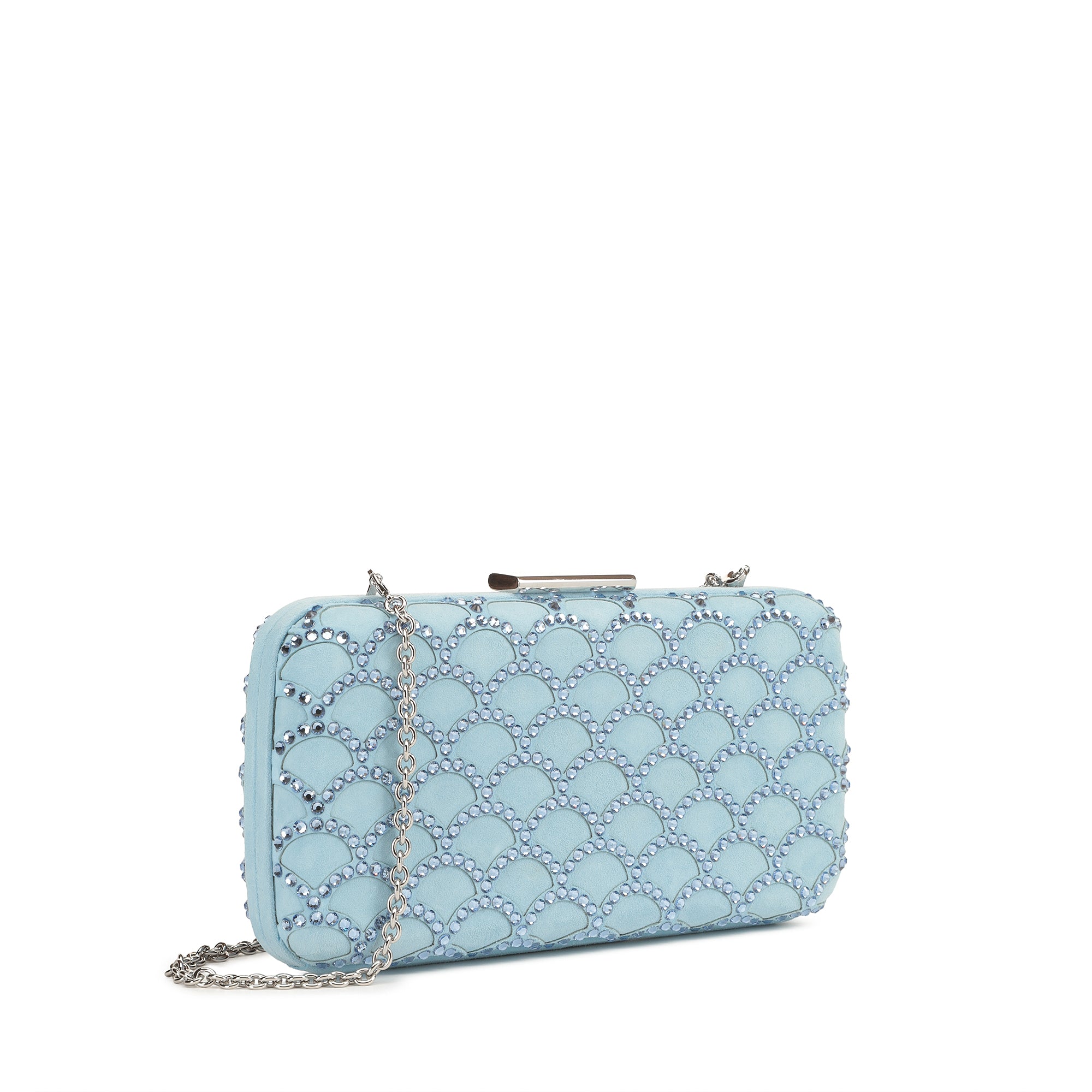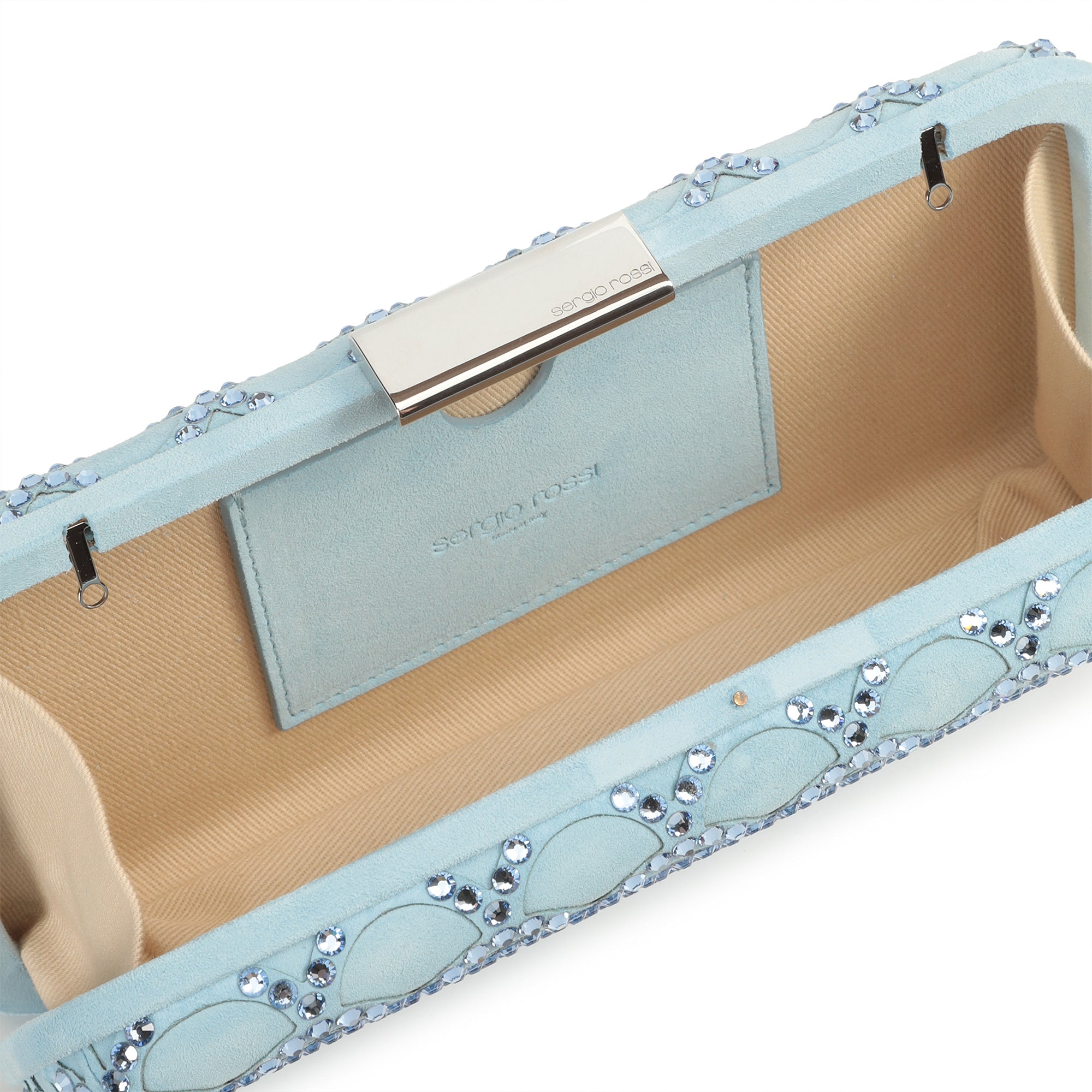 An accessory with precious allure, this sr Mermaid clutch in light blue suede features a sophisticated micro-pavé of matching crystals inspired by an iconic motif from the archives. Designed for the style-conscious woman who loves to complete her look with details.