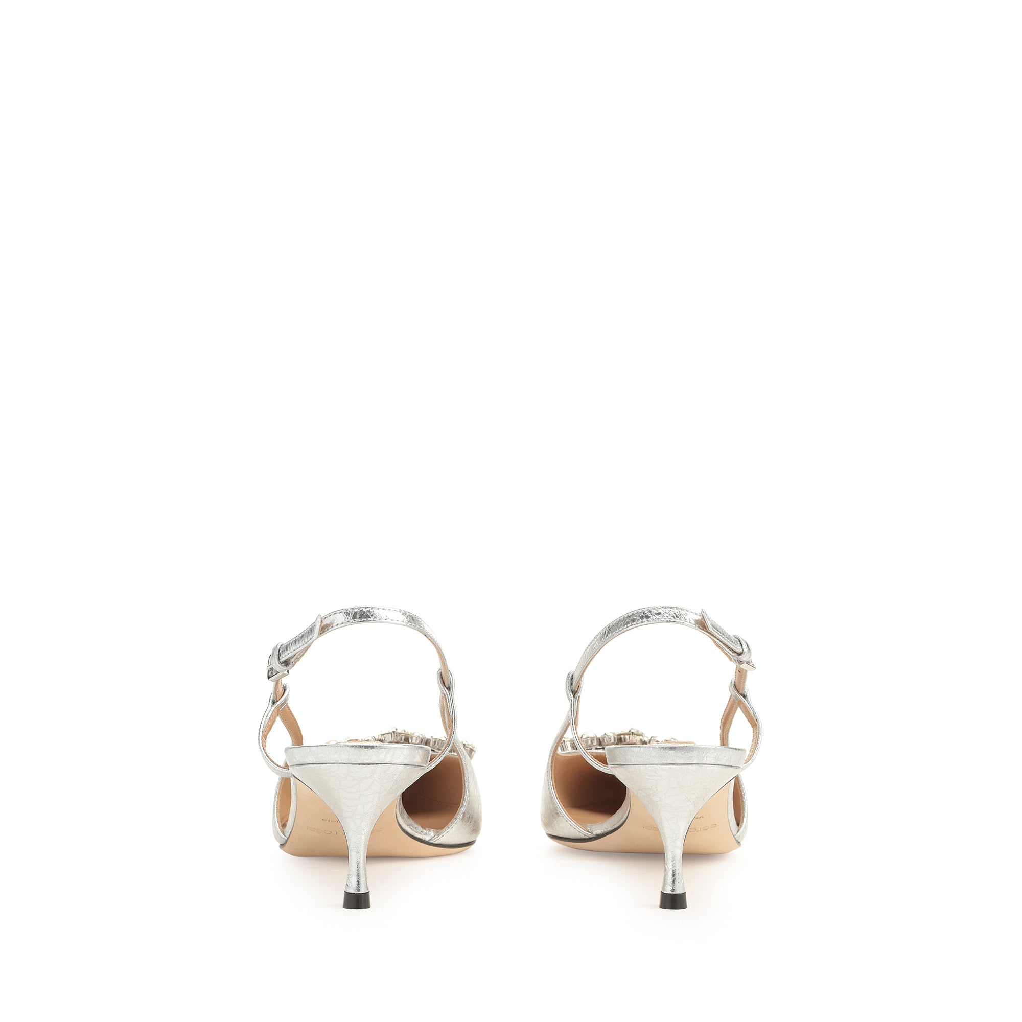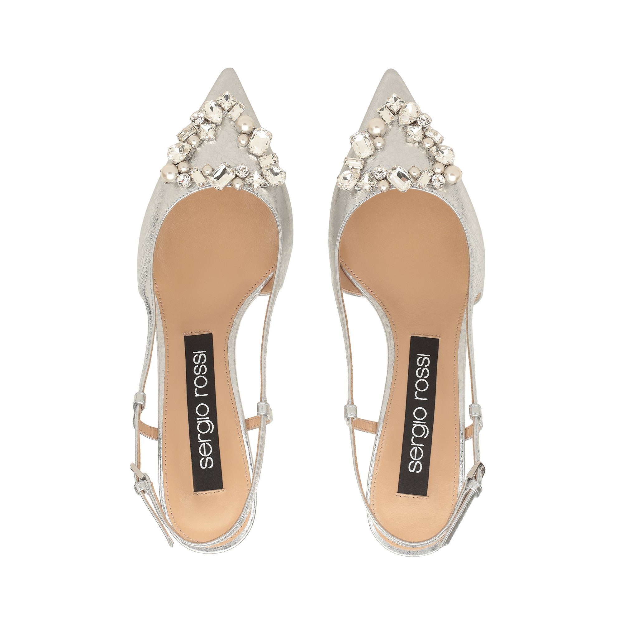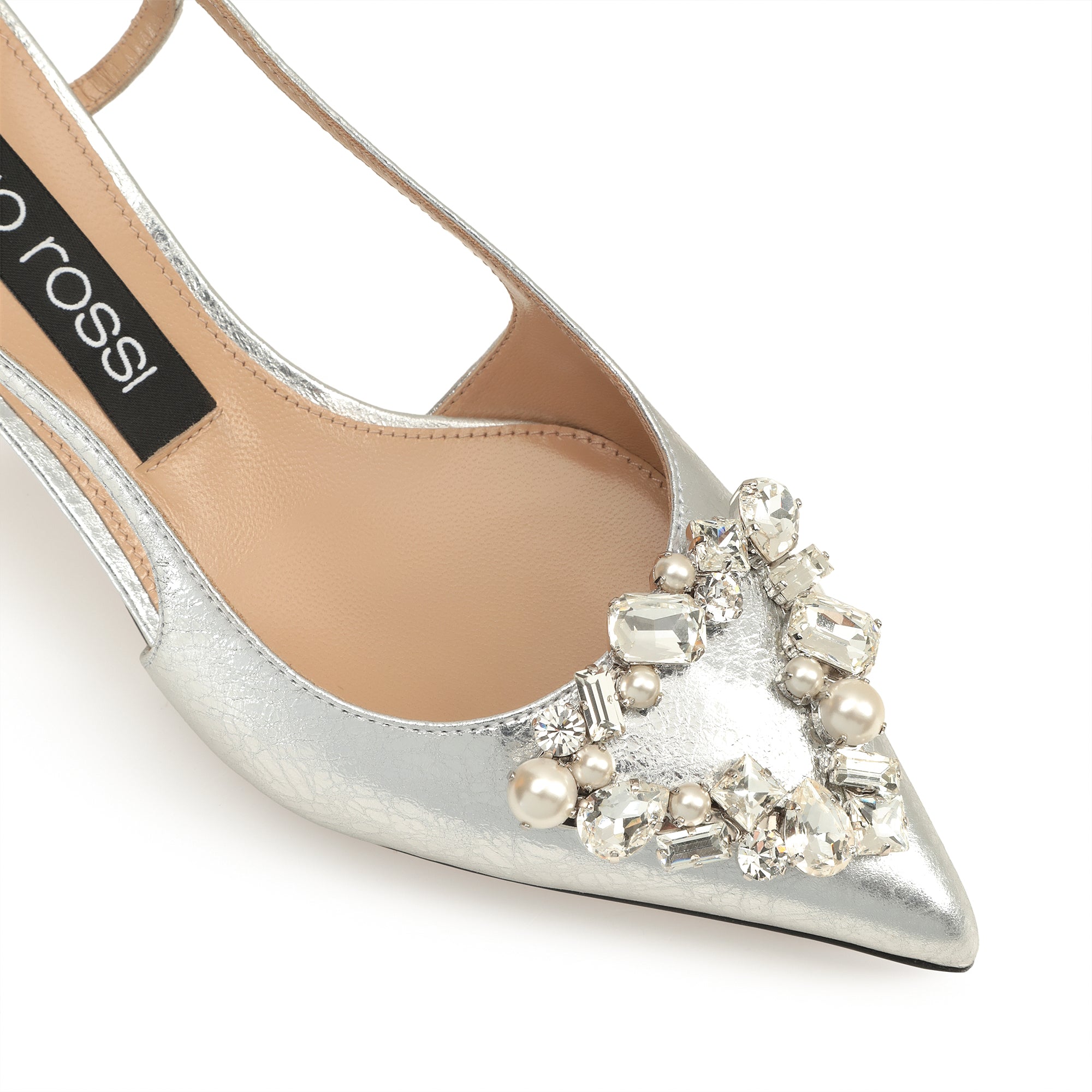 Ces magnifiques escarpins sr Godiva Precious sont réalisés en cuir laminé argenté à effet craquelé. Un détail serti de cristaux et de perles orne leur bout effilé pour compléter ce modèle à l'élégance inoubliable.