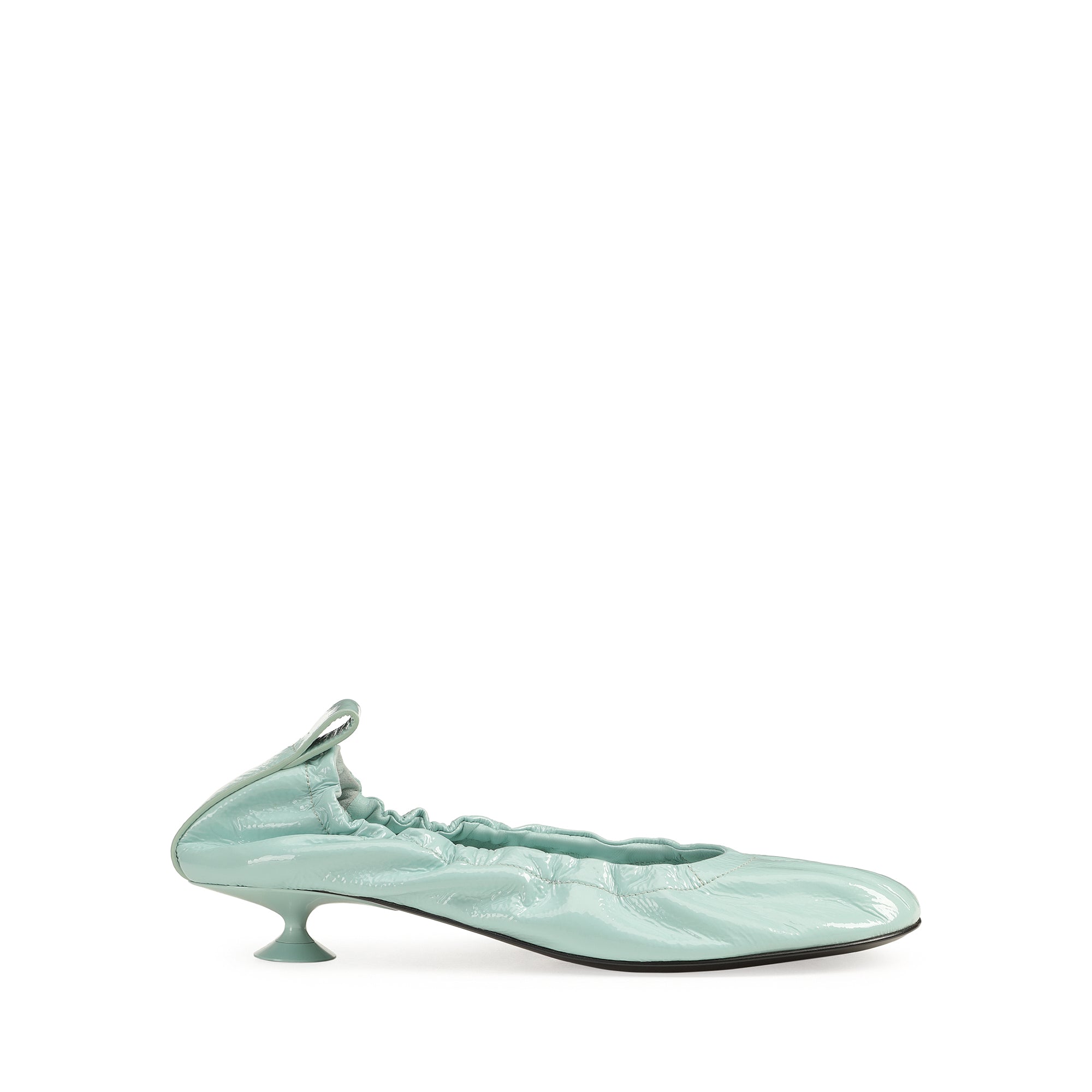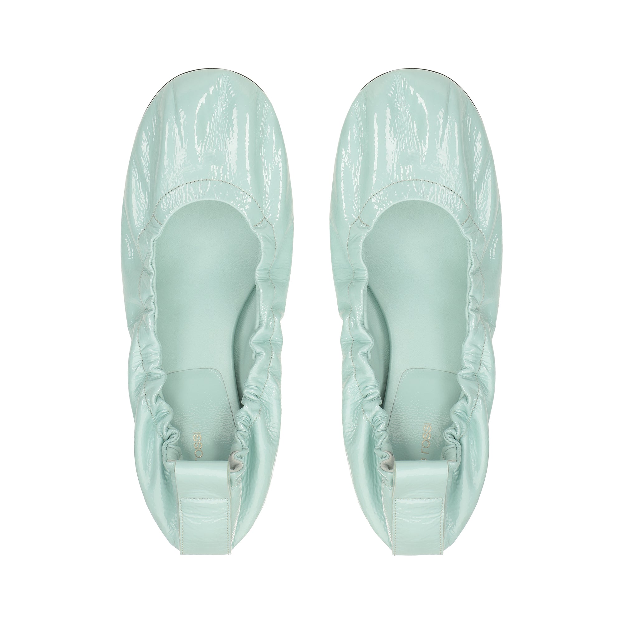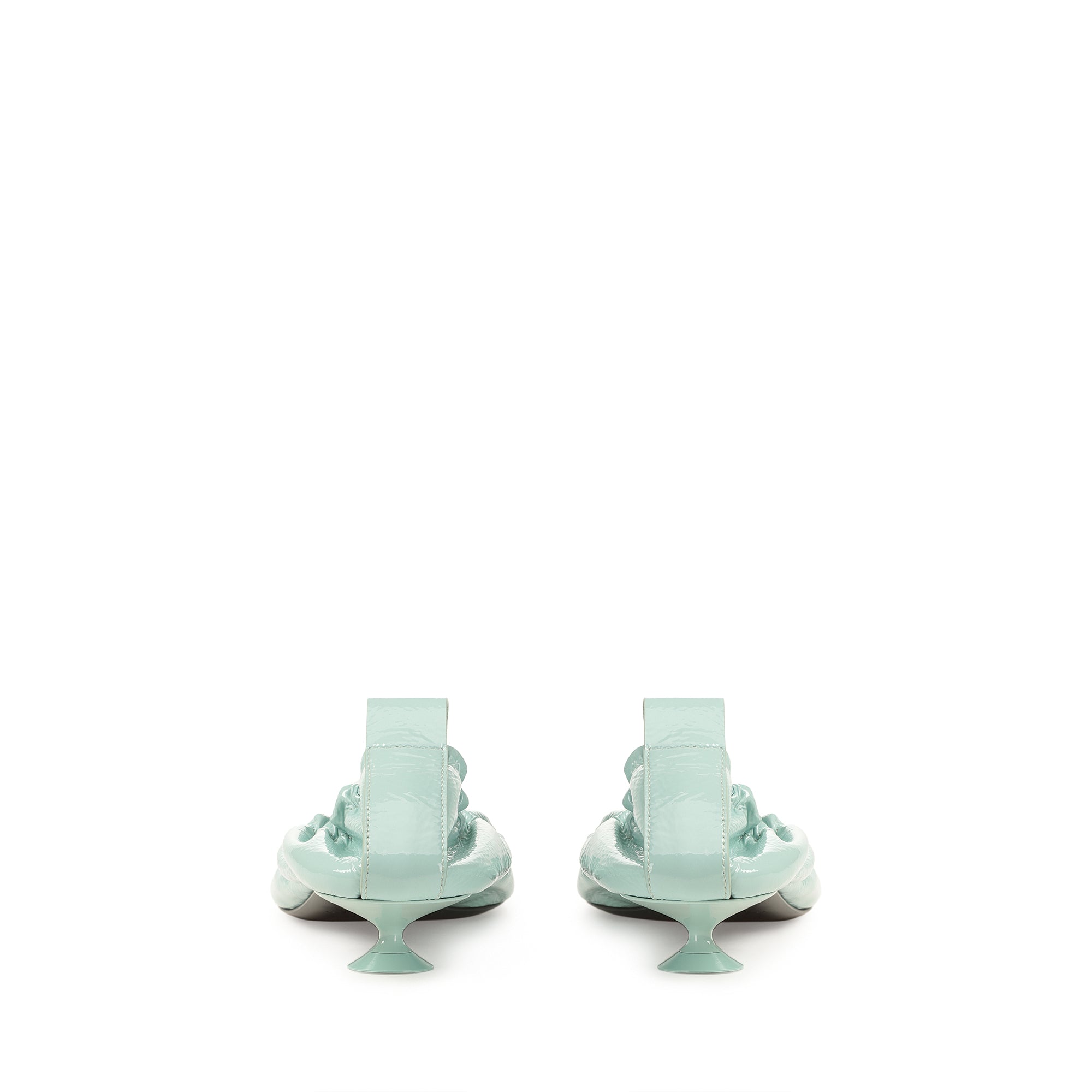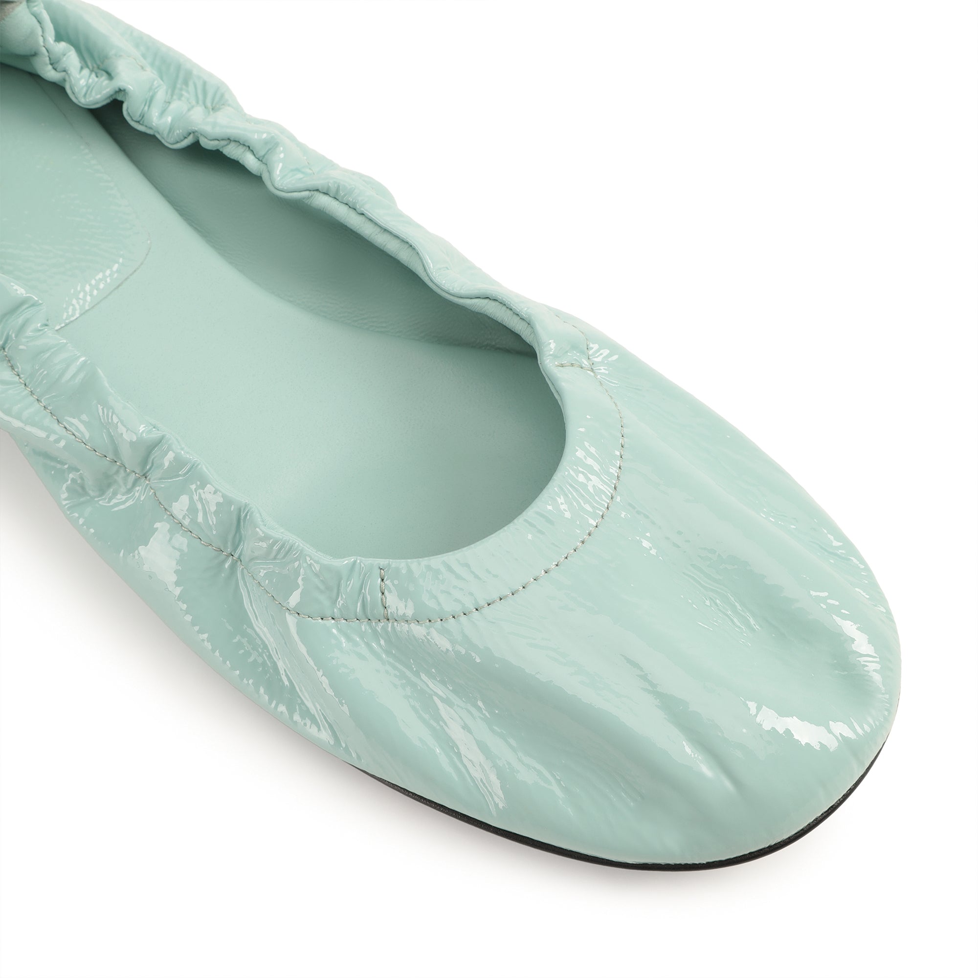 Orb ballet flats in aquamint patent leather with cracked effect. The design features gathered edges and a micro martini heel.