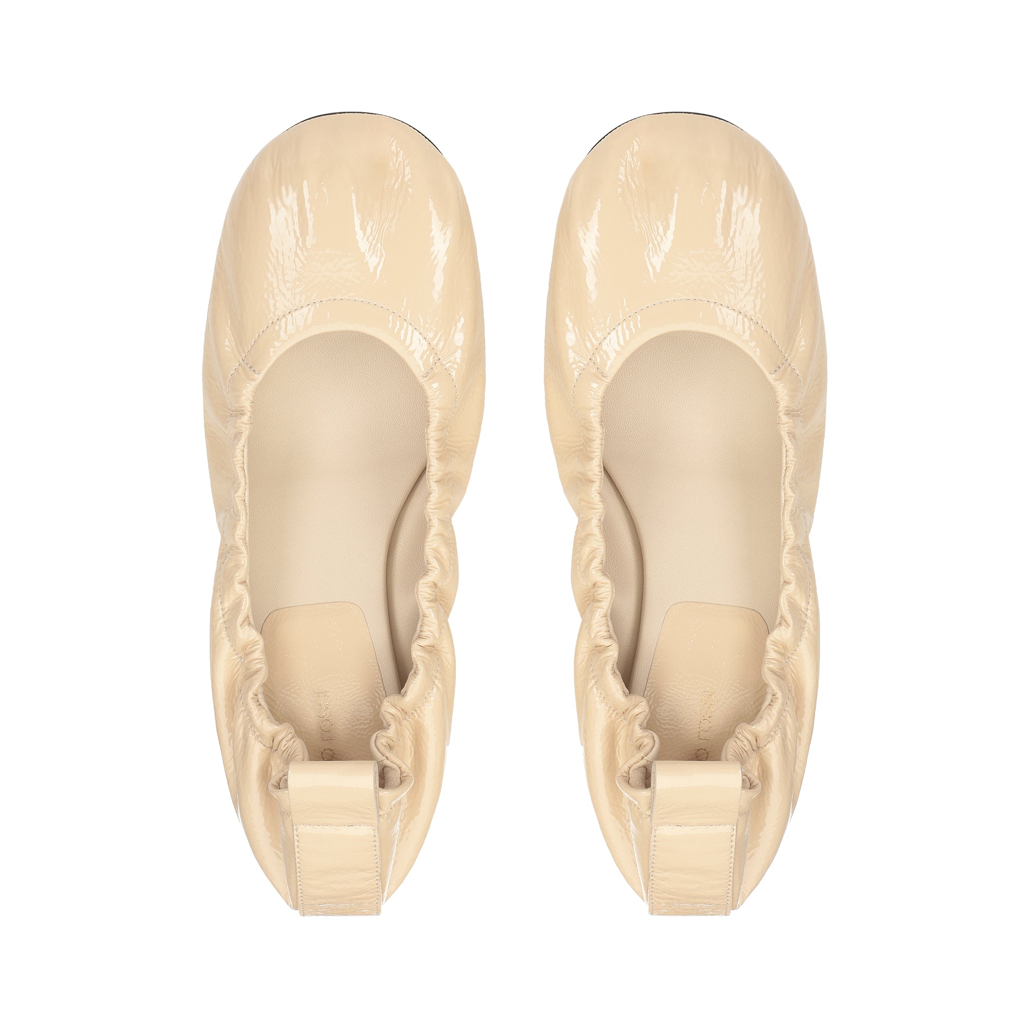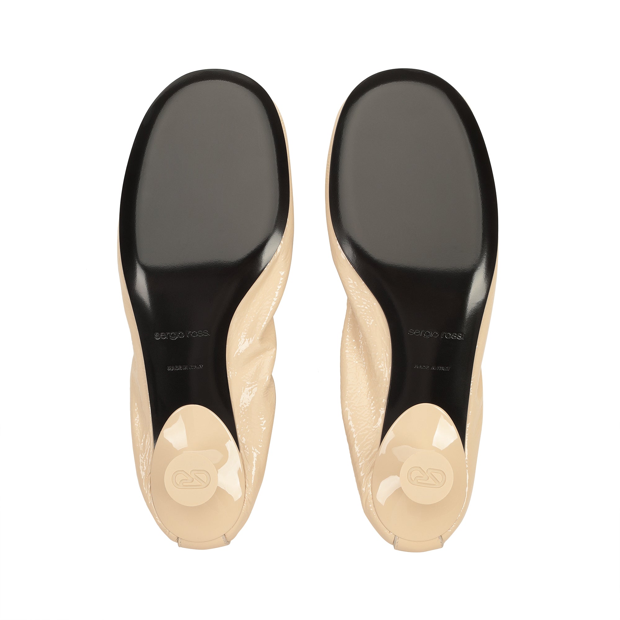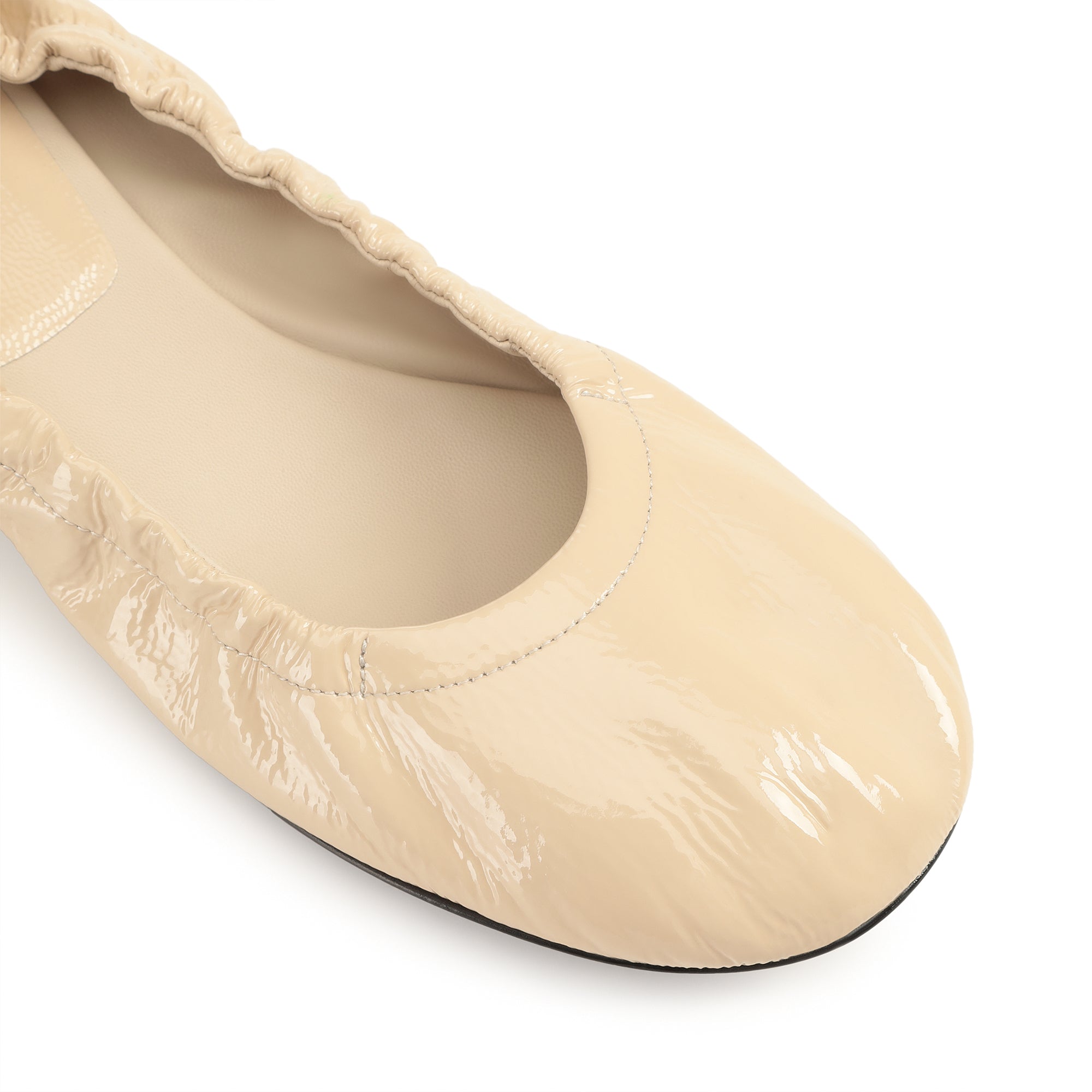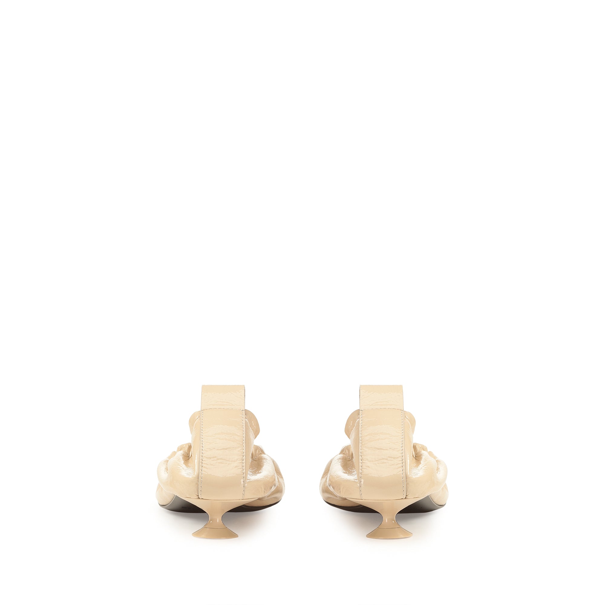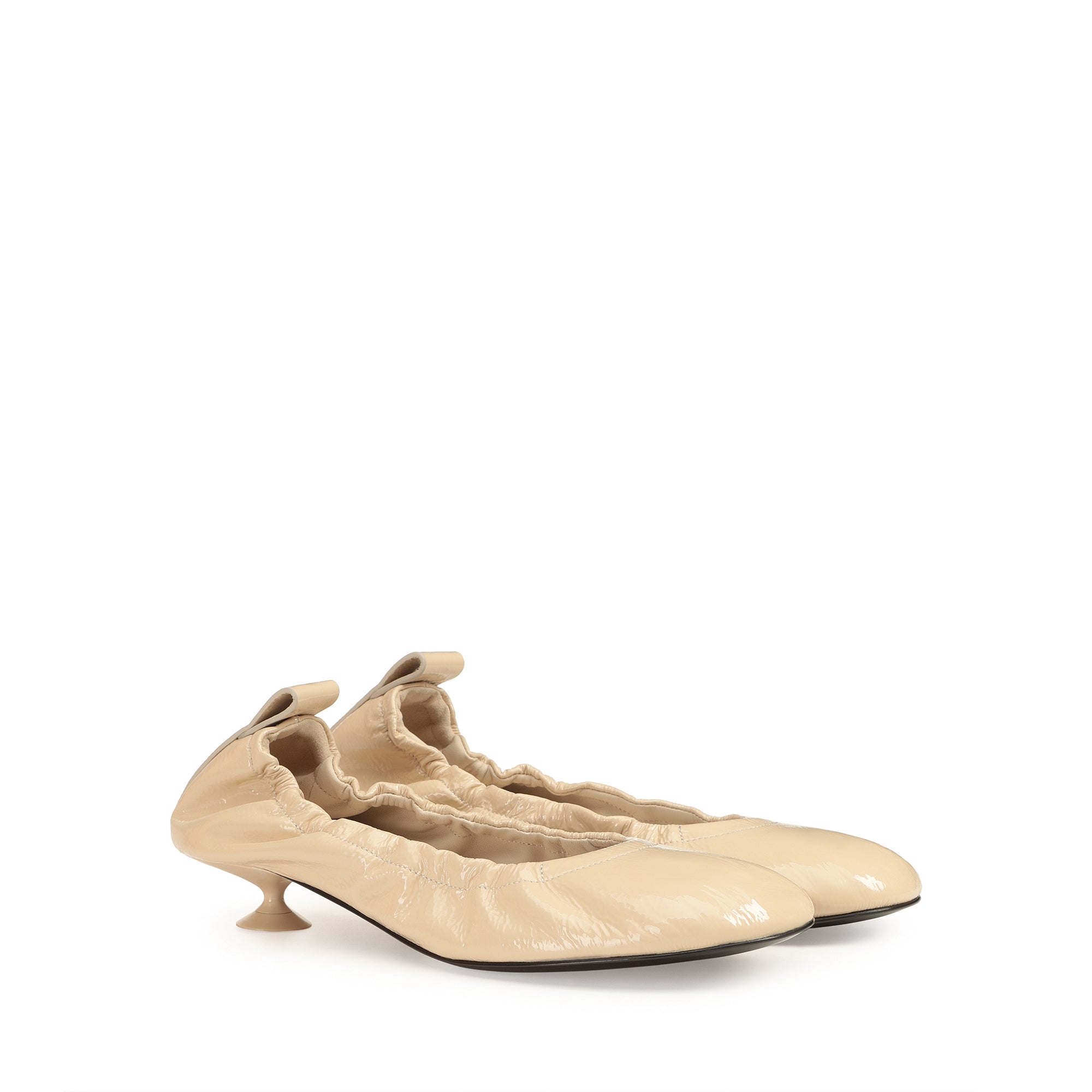 Orb ballet flats in chalk-white patent leather with cracked effect. These feature gathered edges and a micro martini heel.