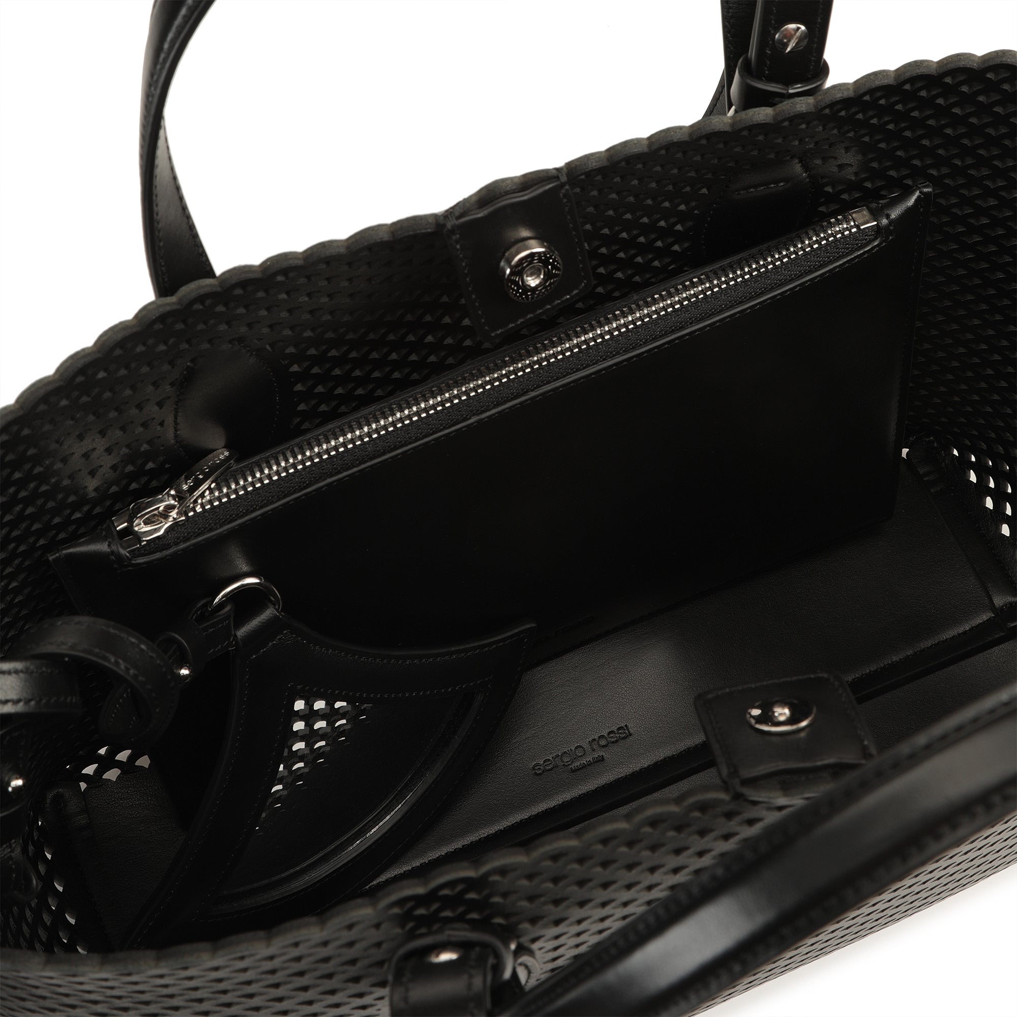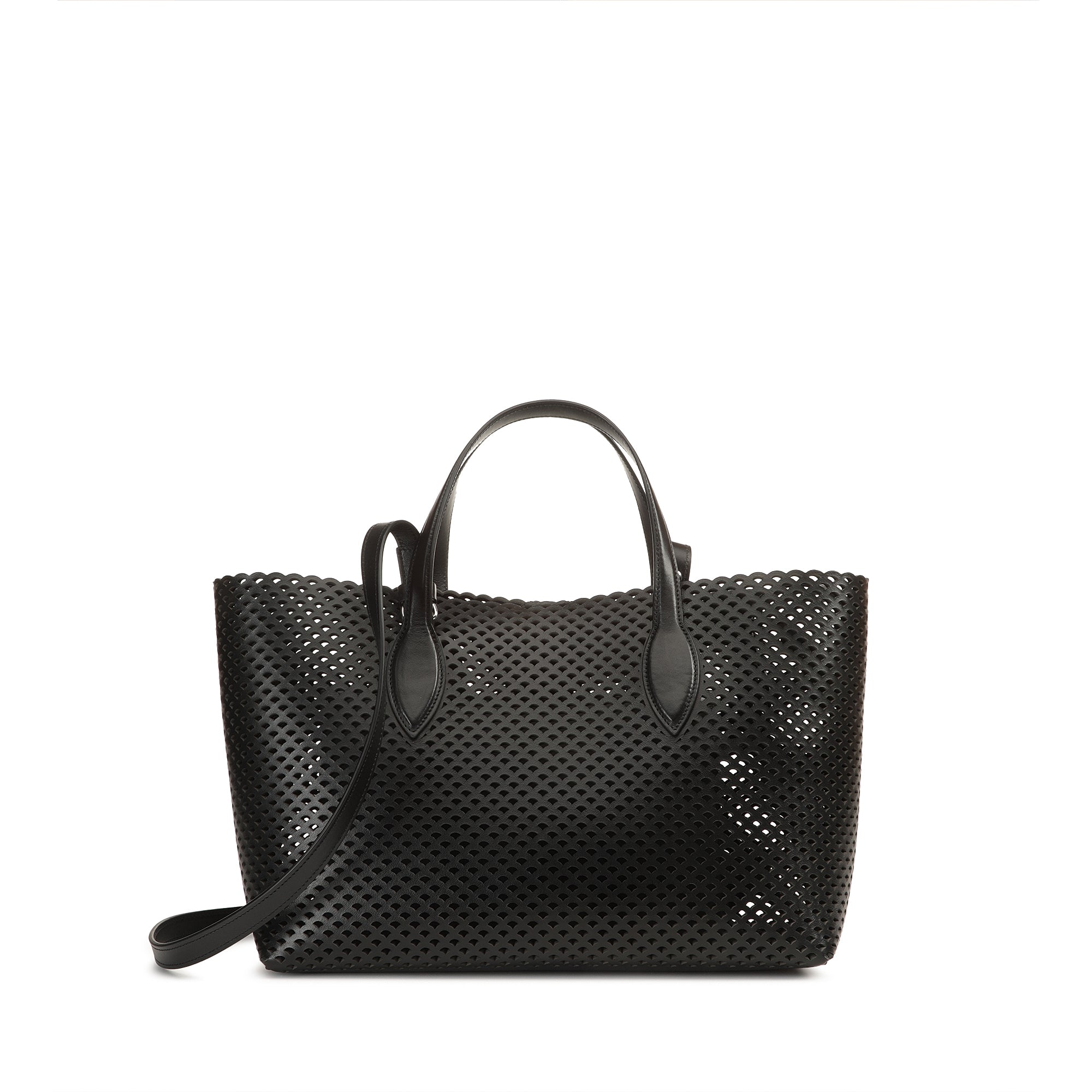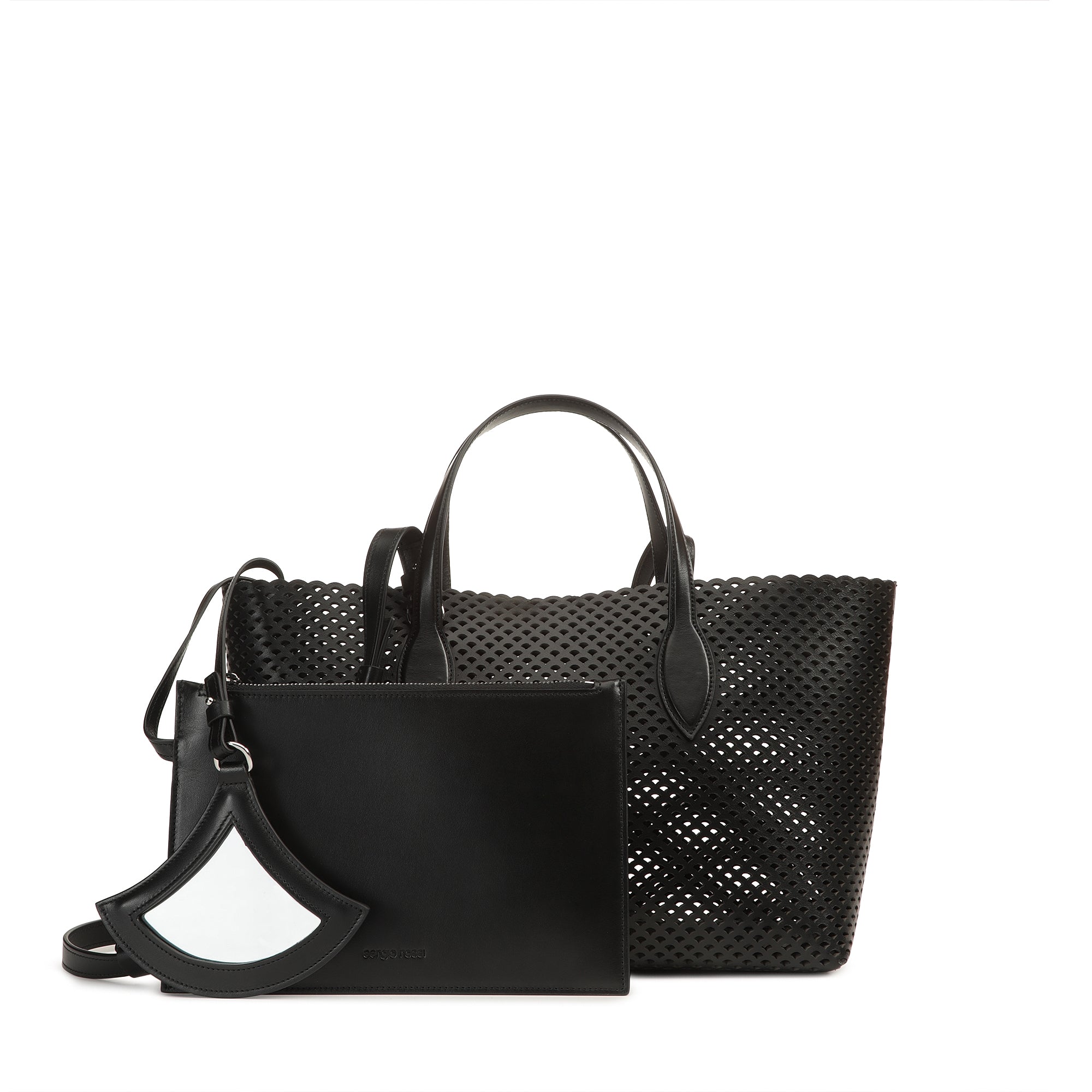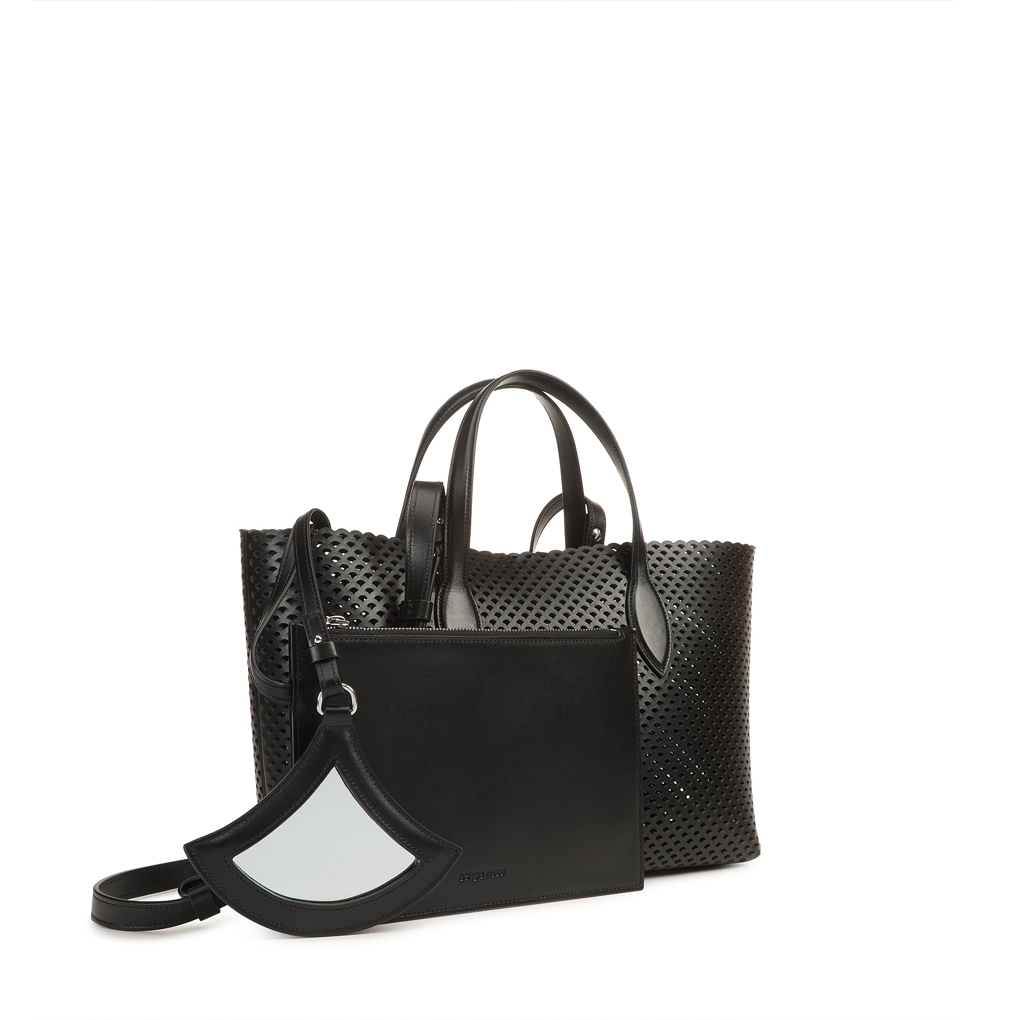 L'iconico motivo traforato si riscopre in un'inedita rivisitazione su questa borsa shopping sr Micro Mermaid, declinata in morbida pelle total black. Completata dalla pratica pochette interna e dallo specchietto, anch'esso ispirato alla forma di una squama, nasce per la donna alla ricerca di un look raffinato e distintivo.